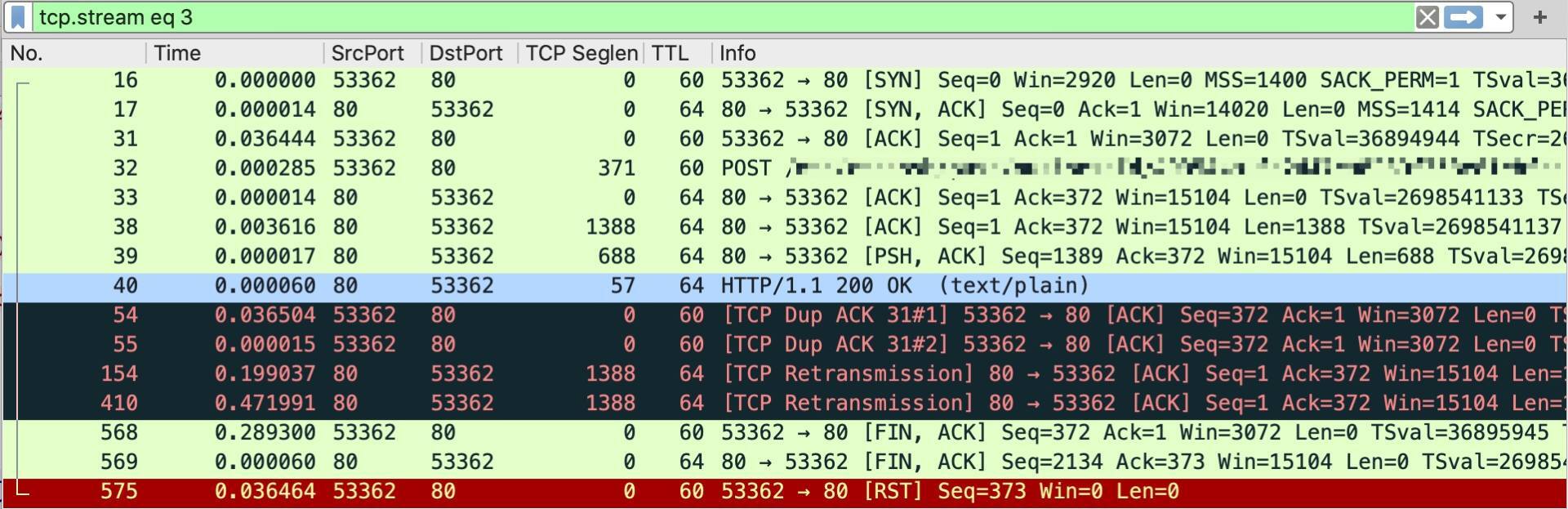 接下来就是重点了。显然,这个TCP流里面,有两个重复确认(54和55号报文),还有两个重传(154和410号报文),在它们之后,就是客户端(源端口53362)发起了TCP挥手,最终以客户端发出的RST结束。