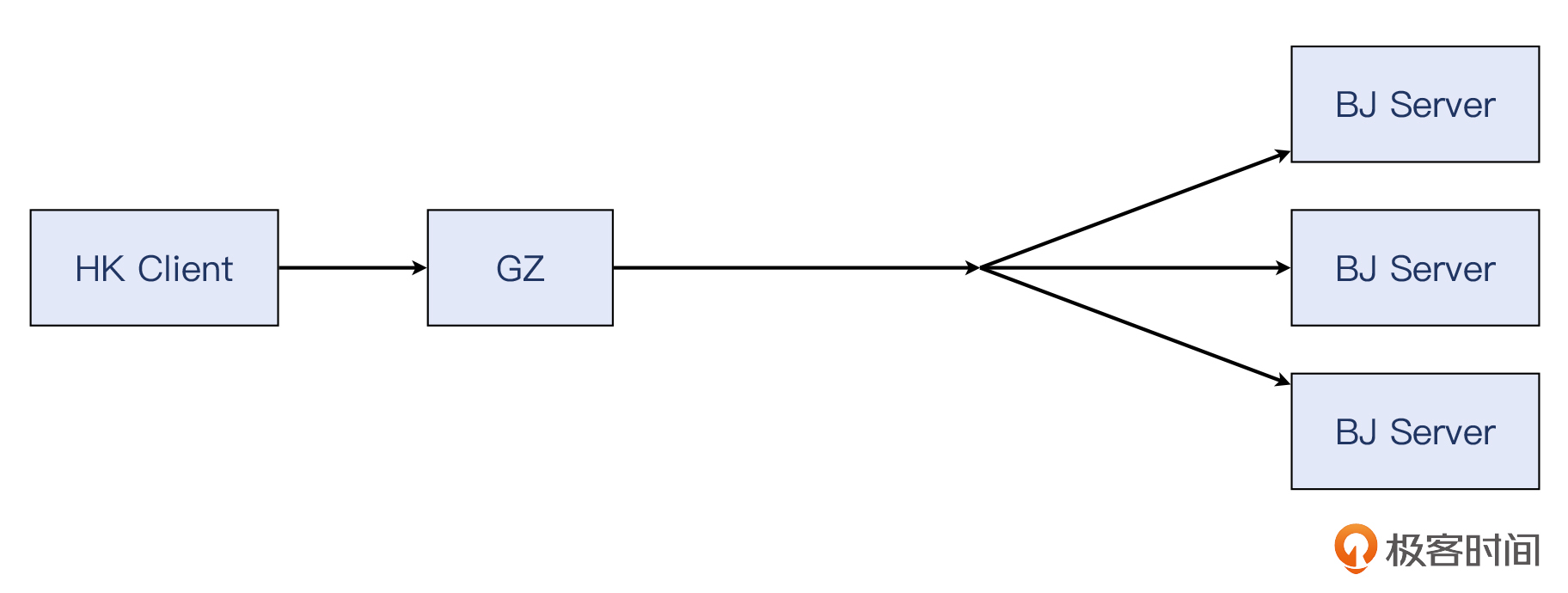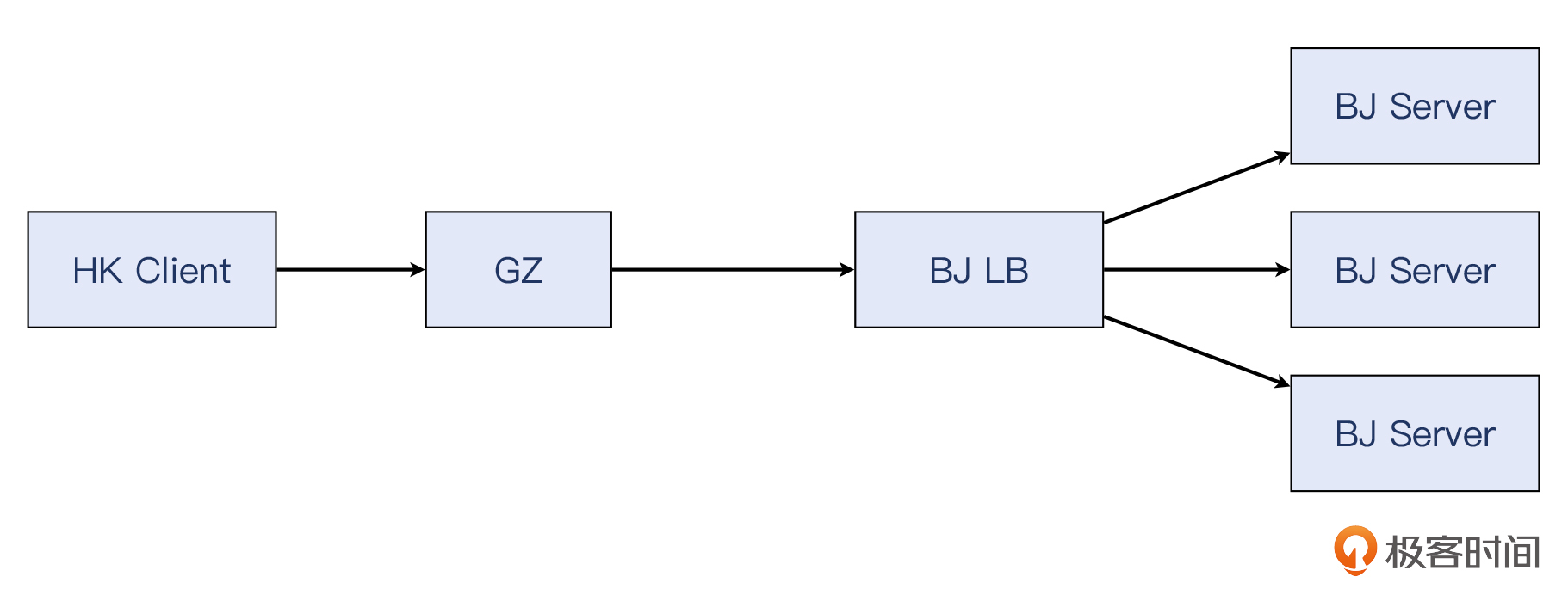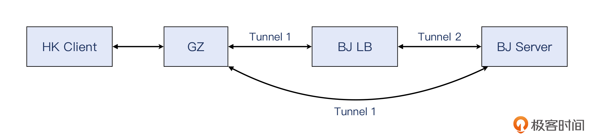 我们来看一下绕过LB的话,请求是如何到服务器的。香港机房的客户端发起HTTP请求,通过专线进入广州机房,然后经由广州-北京专线,直达北京机房的服务器。