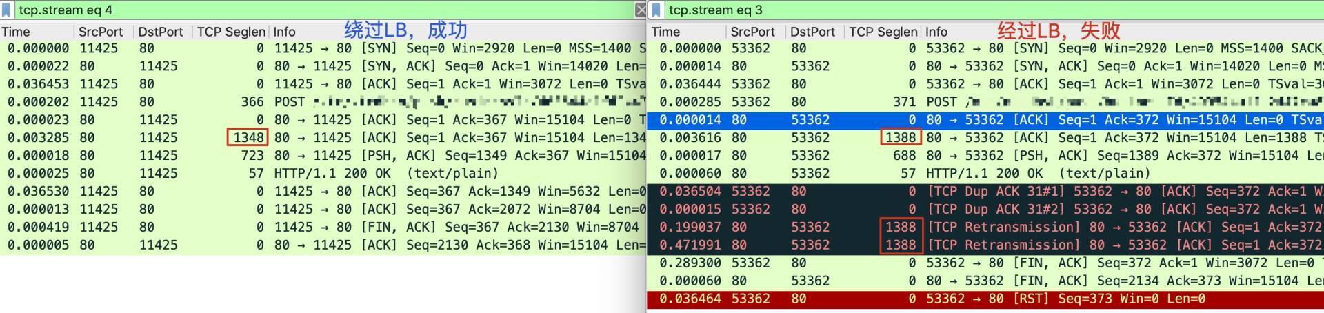 看起来,服务器确实没有问题,整个TCP交互的过程也十分正常。那么,我们再来看一下“经过LB”的失败场景又是什么样的,然后在报文中“顺藤摸瓜”,进一步就能逼近根因了。