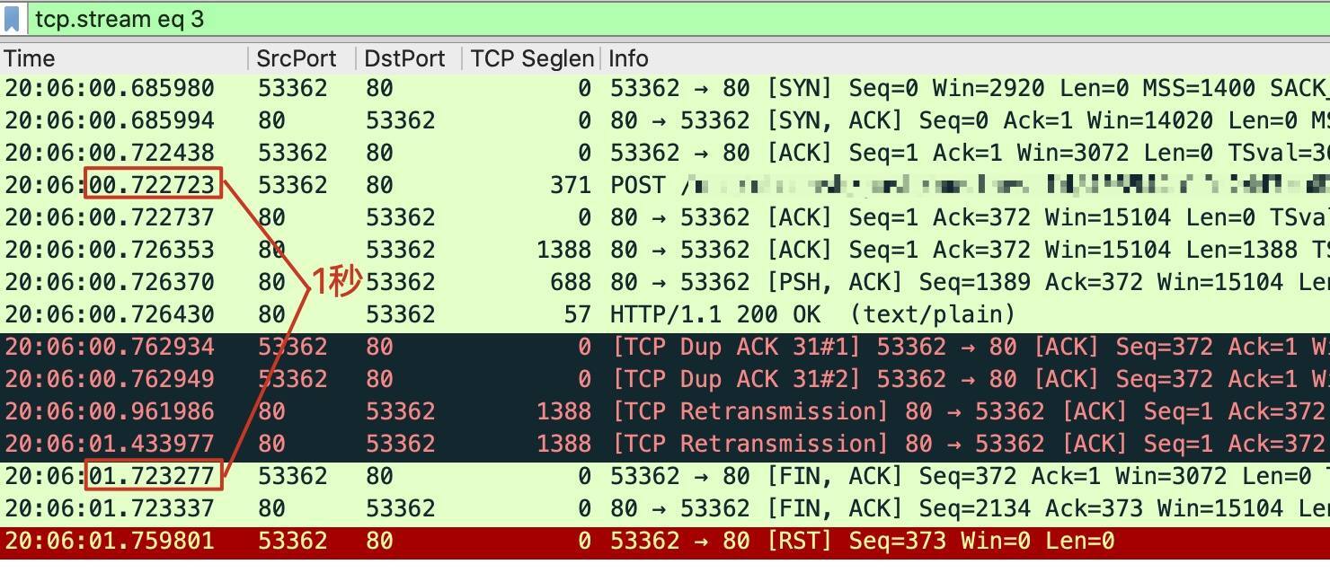 可见,客户端在0.72秒发出了POST请求,在1.72秒发出了TCP挥手(第一个FIN),相差正好1秒,更多的重传还来不及发生,连接就结束了。