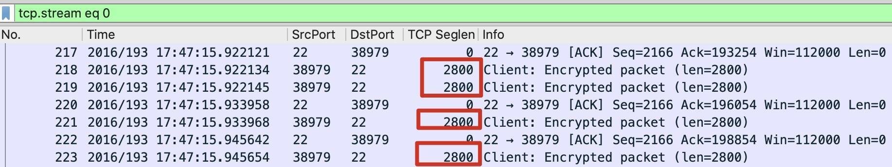 TSO启用后,发送出去的报文可能会超过MSS。同样的,在接收报文的方向,我们也可以启用GRO(Generic Receive Offload)。比如下图中,TCP载荷就有2800字节,这并不是说这些报文真的是以2800字节这个尺寸从网络上传输过来的,而是由于接收端启用了GRO,由接收端的网卡负责把几个小报文“拼接”成了2800字节。