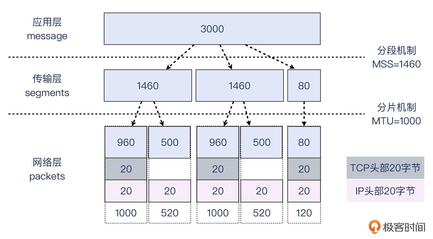 补充:为了方便讨论,我们假设TCP头部就是没有Option扩展的20字节。但实际场景里,很可能MSS小于1460字节,而TCP头部也超过20字节。