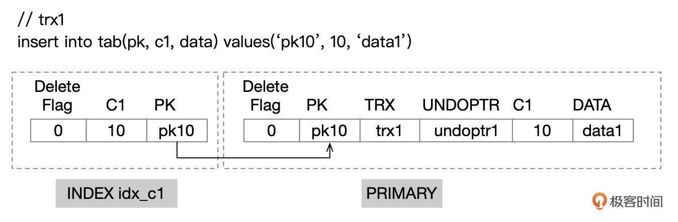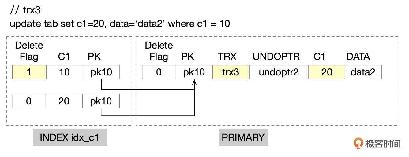 更新之后,索引idx_c1中的记录(10, pk10)被标记为已删除,同时插入新的索引记录(20, pk10)。主键记录中,db_trx_id字段更新为trx3,db_roll_ptr指向UPDATE操作产生的undo记录,C1字段更新为20。