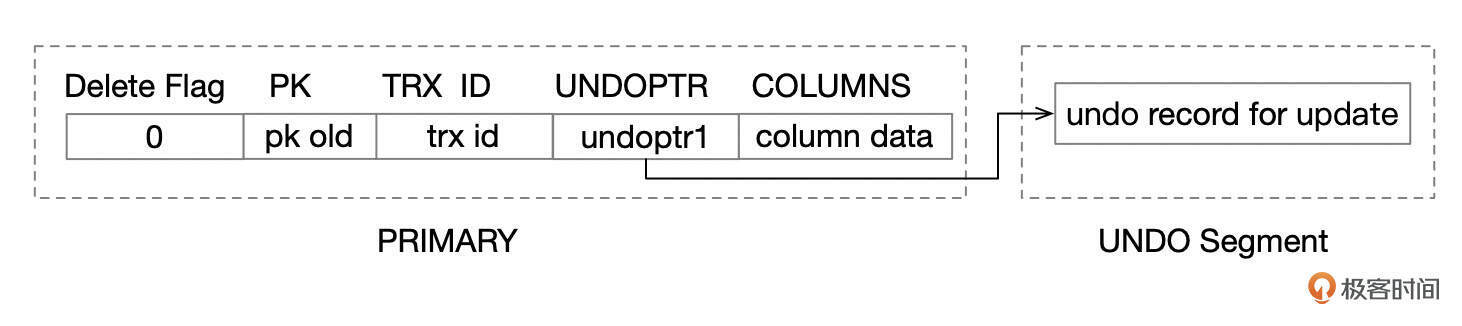 对于INSERT操作,UNDO PTR有一个特殊的标识为,标记当前的操作为INSERT。