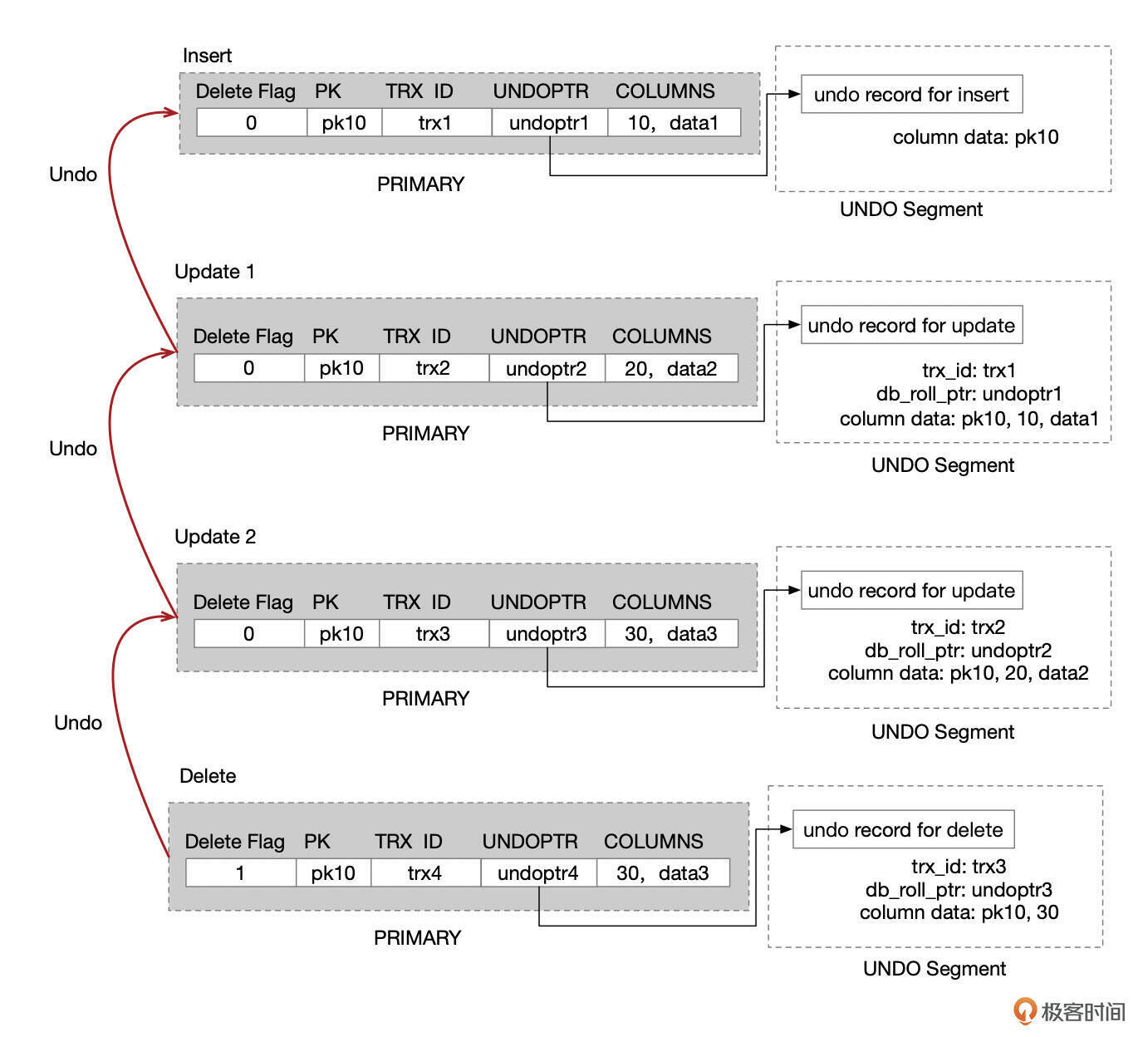 下面这张图中,记录pk10 insert后,更新了两次,最后被delete了,通过Undo,可以构建出记录的任何一个版本。
