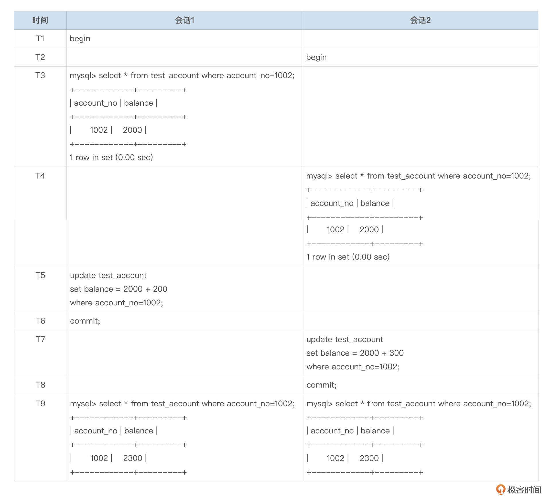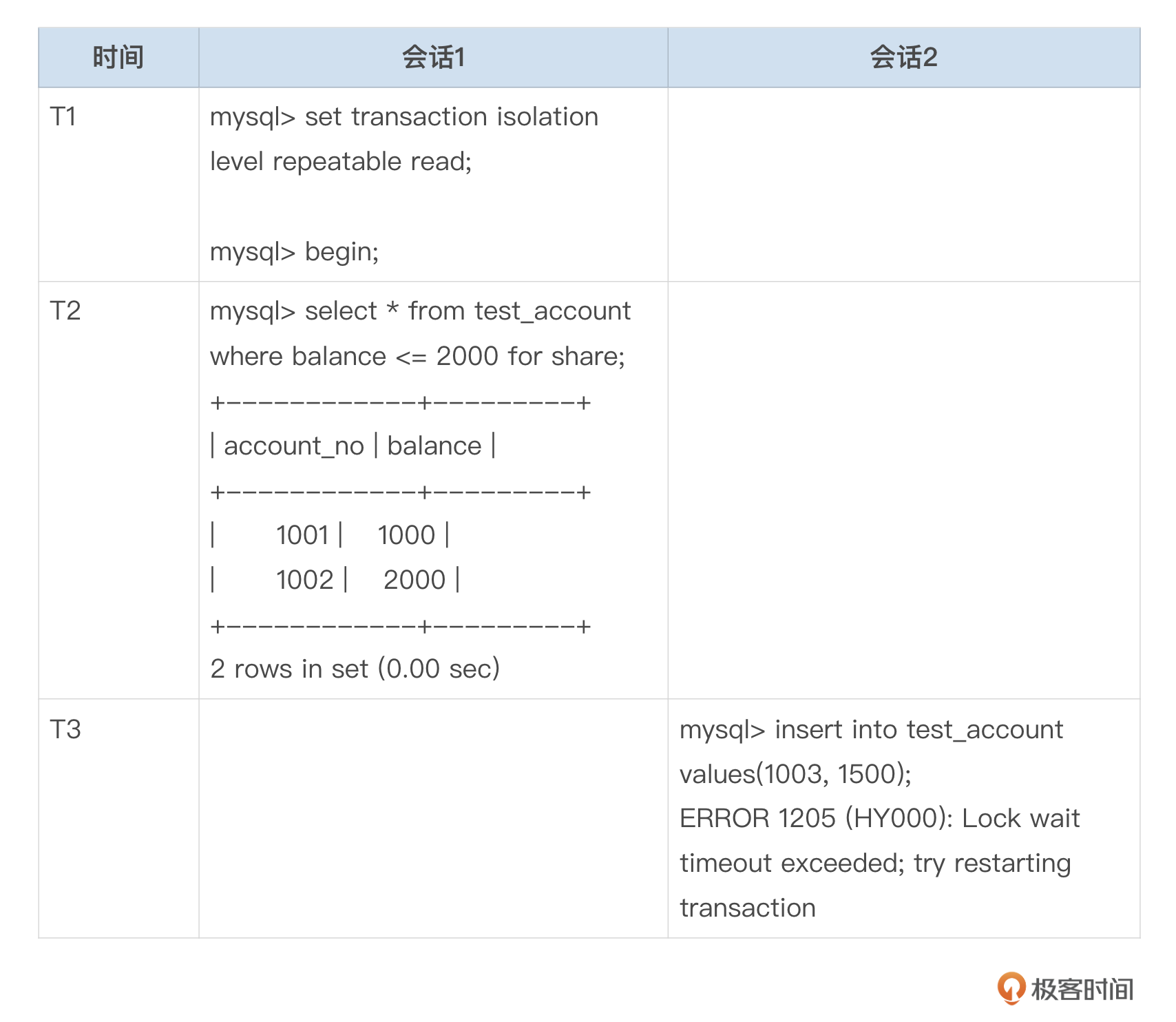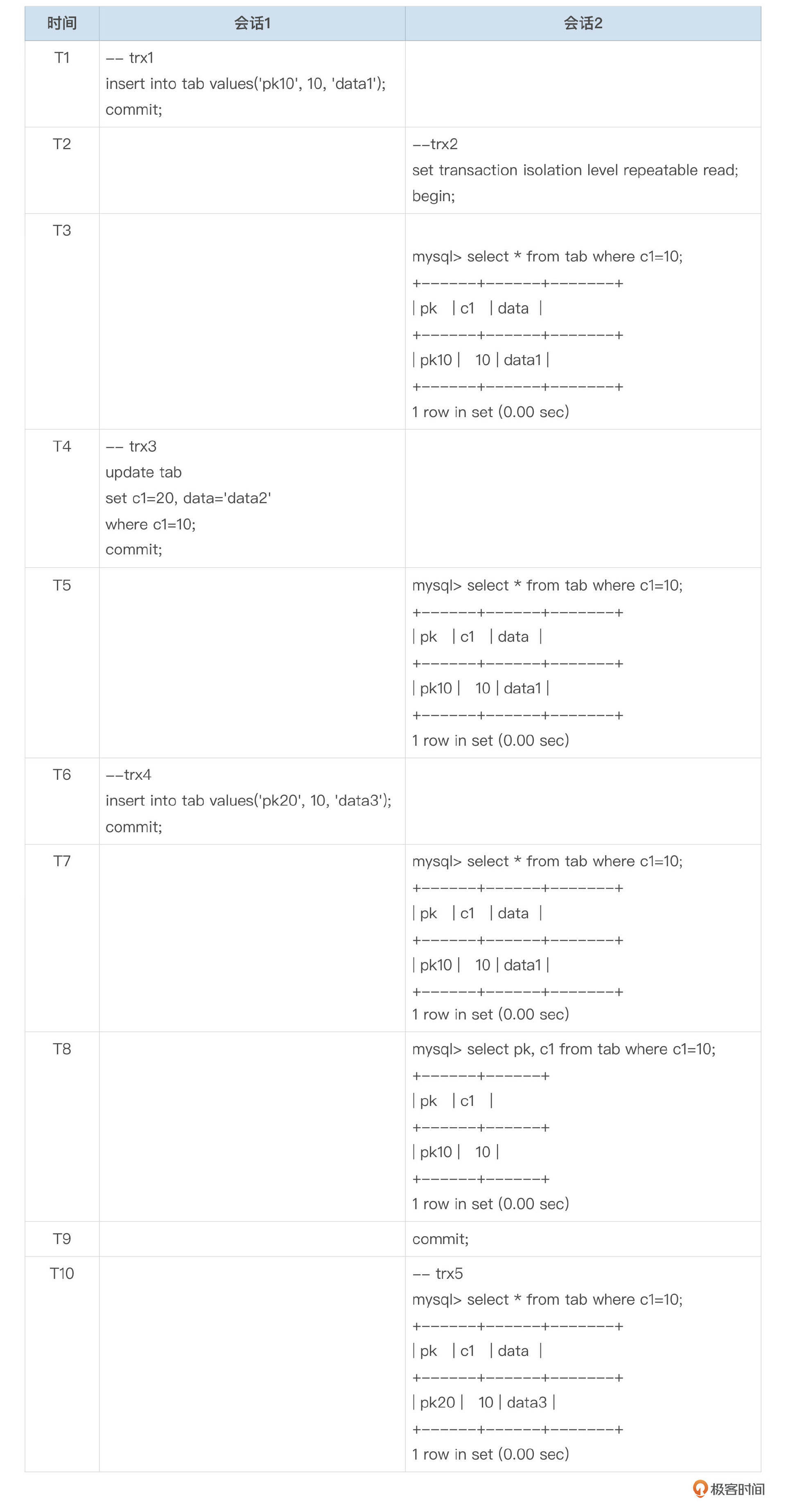 开启2个会话,按以下表格中的时间顺序依次执行SQL。