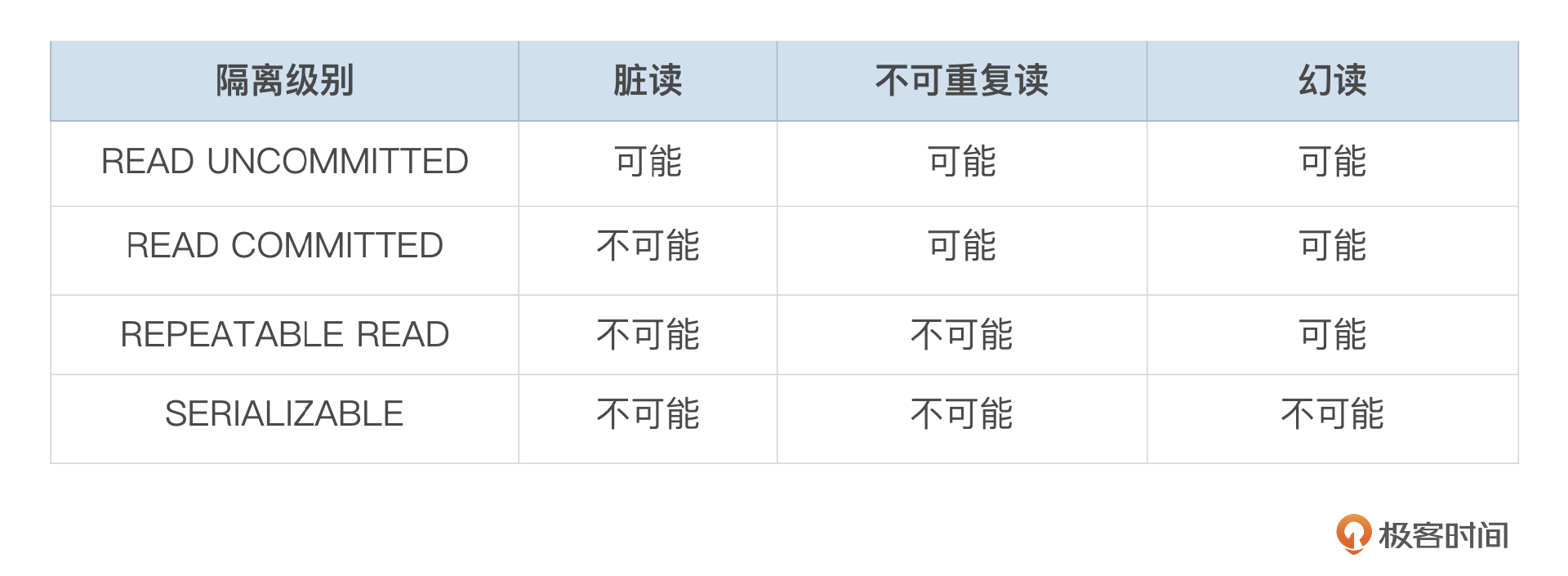 根据事务是否会遇到上面的几种现象,ISO SQL标准定义了4种隔离级别,参考下面这个表格。