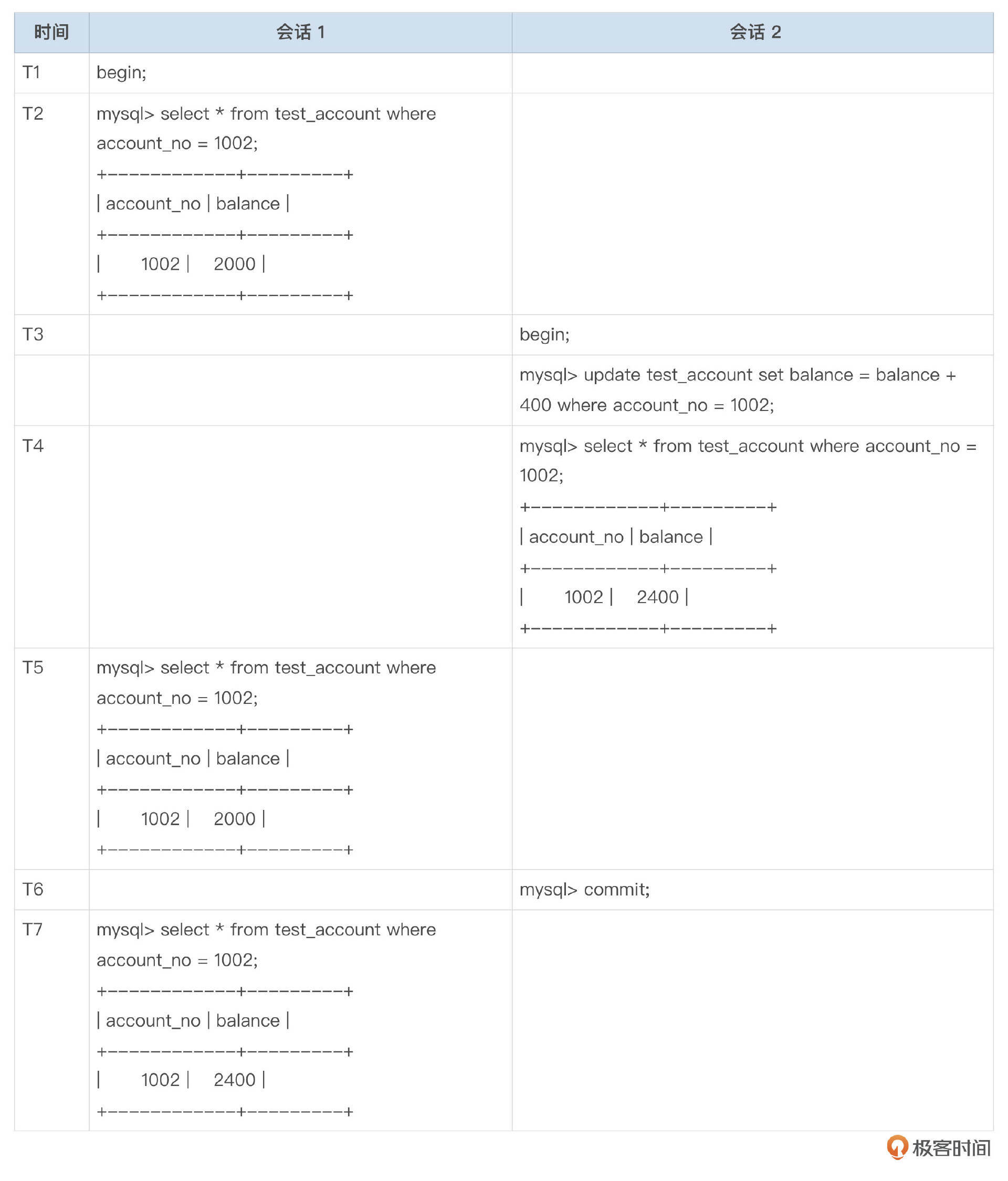 例子中,会话2在T6时刻提交了修改,会话1在T2和T7两个时间点读取到的记录发生了变化。
