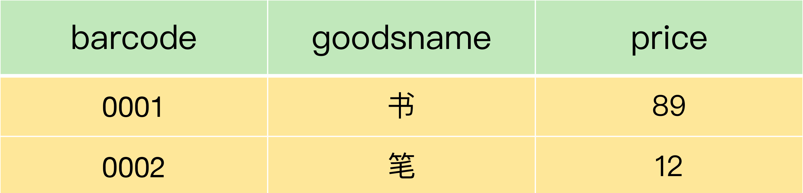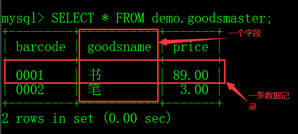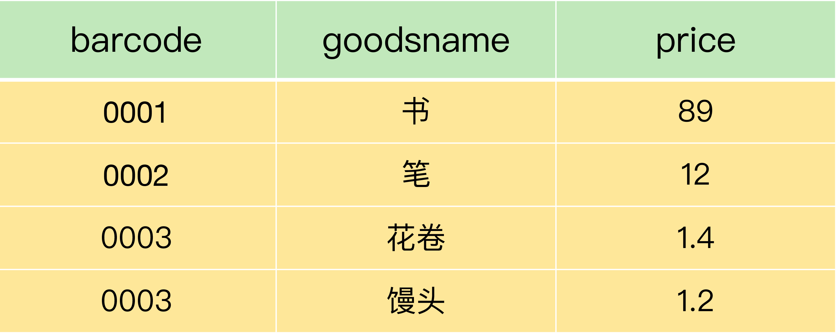 - Type:表示字段类型,这里barcode、goodsname是文本型的,price是整数类型的。