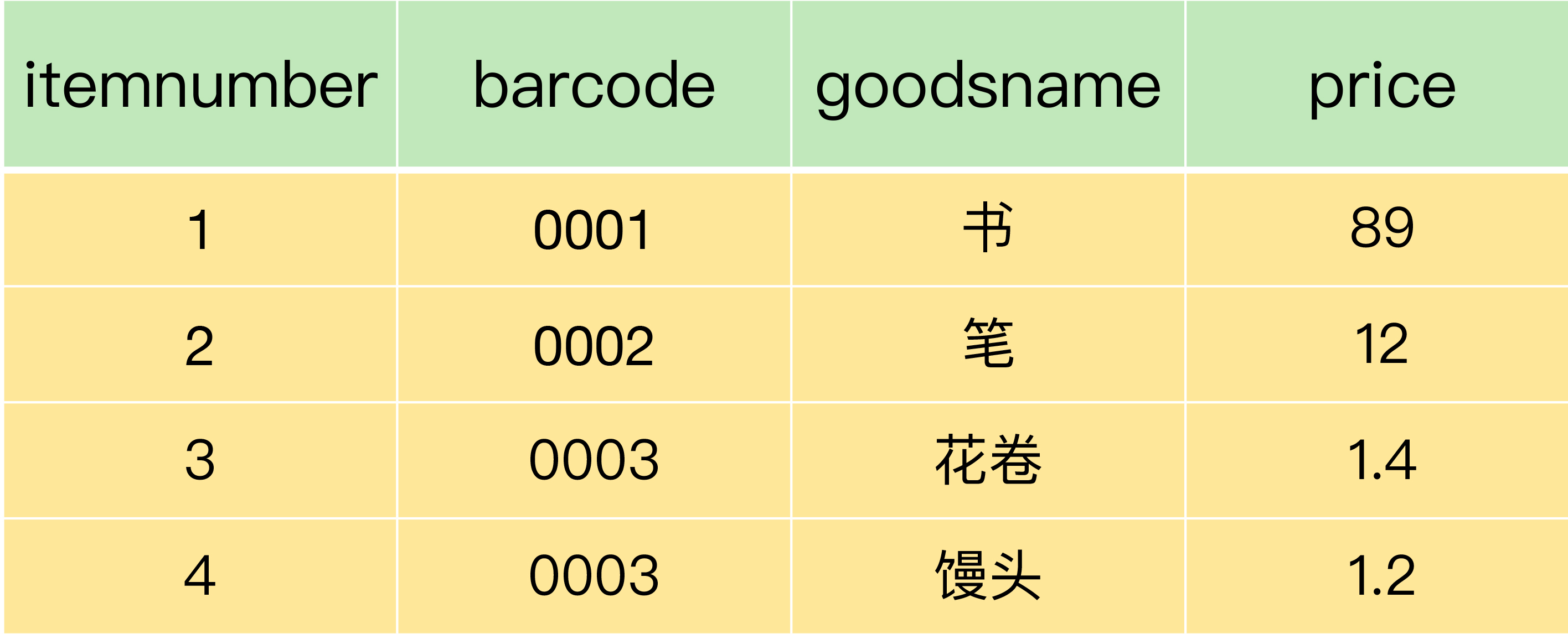 商品名称“goodsname”行不行呢?不行,原因是重名的商品太多了,比如“笔”,大家都可以生产一种叫“笔”的商品,各种各样的笔,不同规格的,比如长的、短的;不同材料的,比如墨水的、铅芯的……由于可能重复,商品名称和数据记录之间不能形成一一对应的关系,所以“goodsname”不能作为主键。同样,价格“price”重复的可能性很大,也不能做主键。