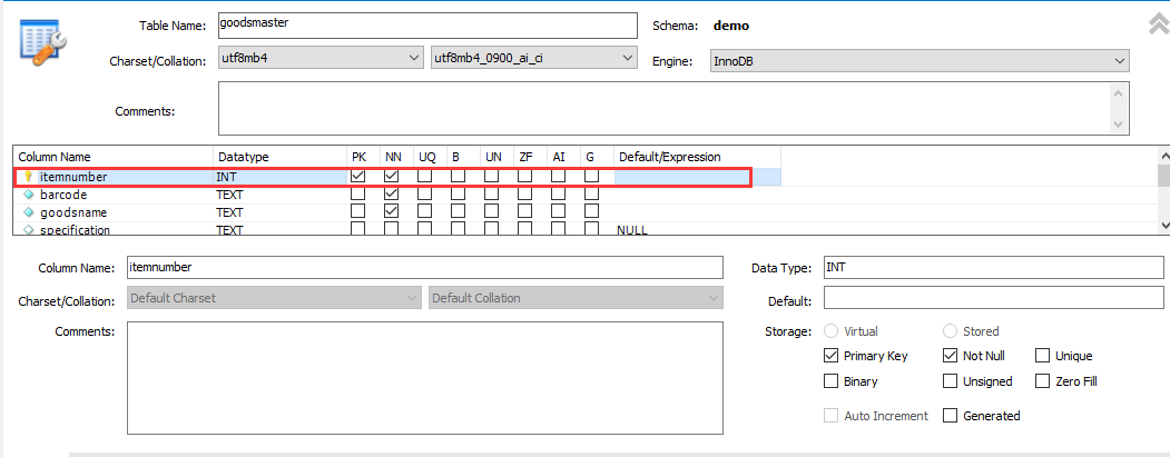 我们添加字段商品编号“itemnumber”为主键,这样,我们的商品表“goodsmaster”就有了主键。