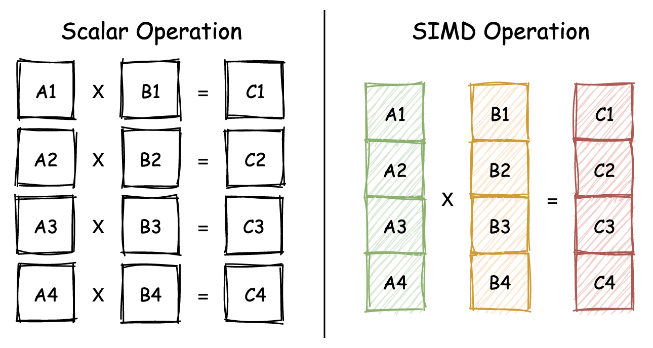 而在右侧的 SIMD 版本中,针对 A1 到 A4 这四组乘法运算,我们可以仅通过一条 SIMD 指令,就能够同时完成针对这四组数字的对应乘法运算。相较于普通的标量乘法运算来说,SIMD 会使用特殊的寄存器来存储一个向量中的一簇数据,然后再以整个“向量”为单位进行运算。因此,相较于传统的标量计算,SIMD 的性能会有着成倍的增长。