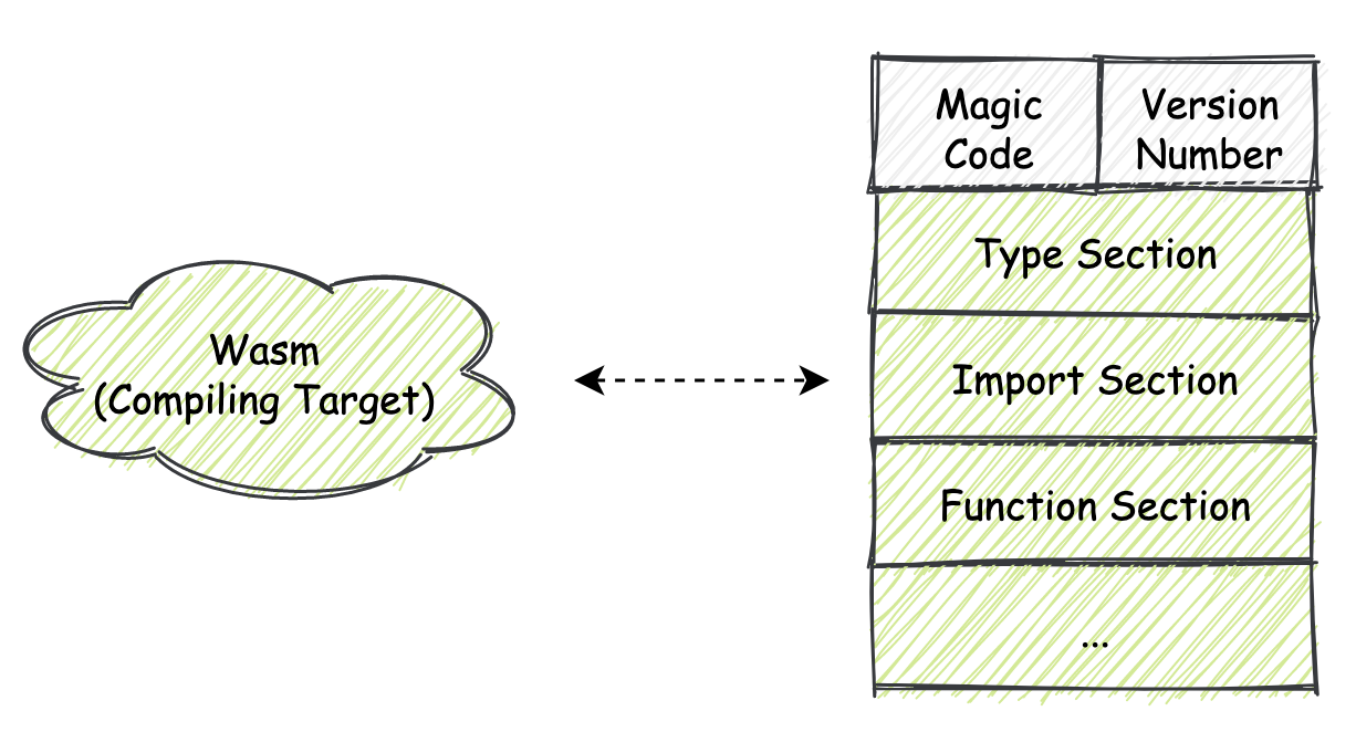 或者说同我们常见的 Windows 上的 “.exe” 可执行文件,以及 Linux 下的 ELF 可执行文件类似,一个包含有虚拟指令的 Wasm 文件,它的内部组成结构应该是怎样的?