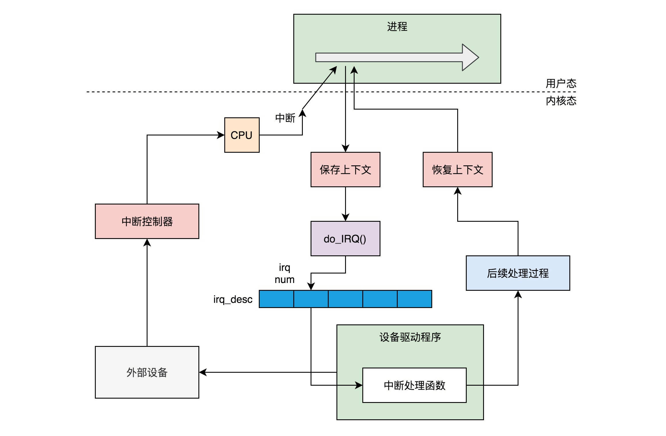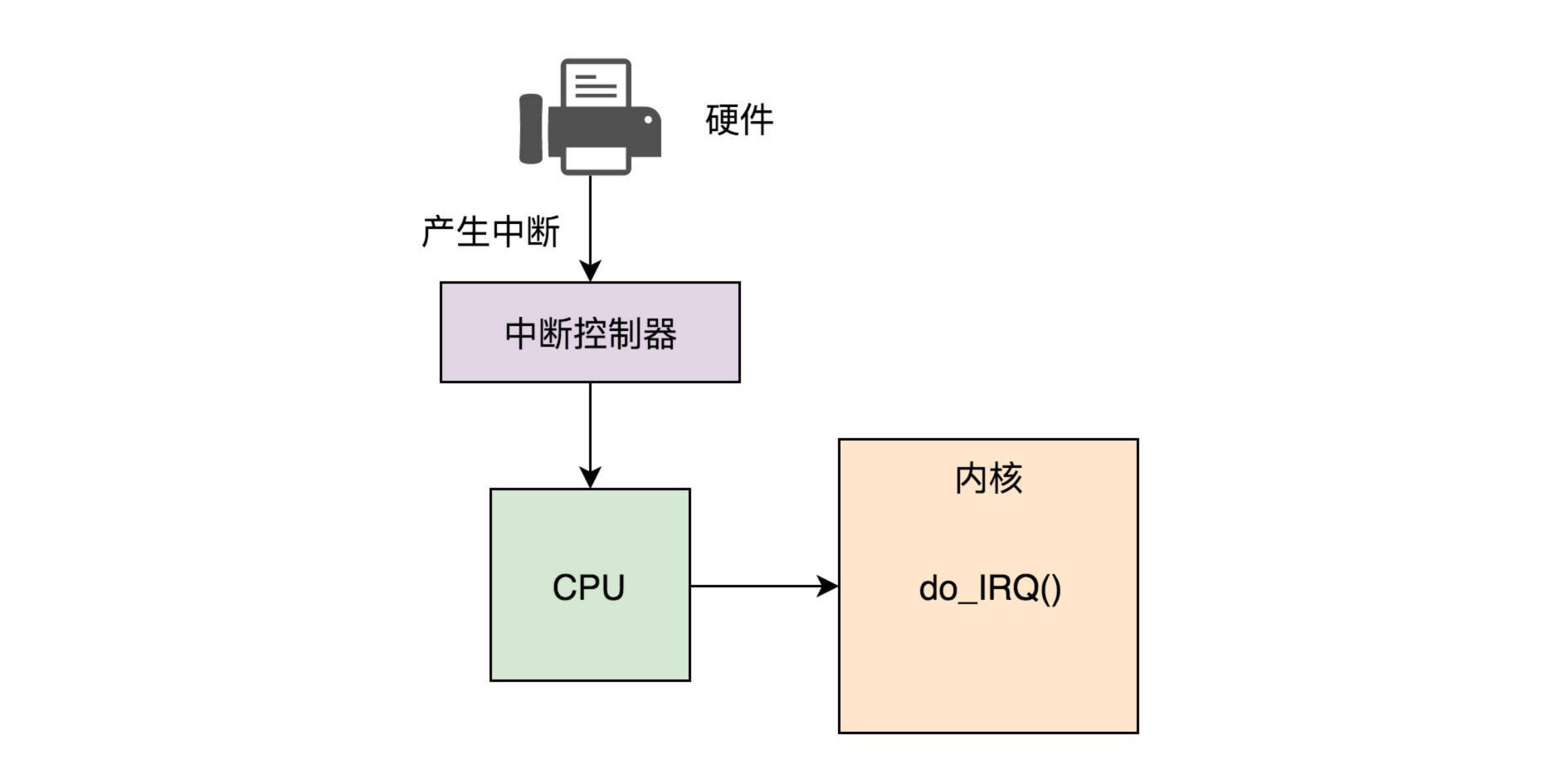为了响应中断,我们一般会有一个硬件的中断控制器,当设备完成任务后触发中断到中断控制器,中断控制器就通知CPU,一个中断产生了,CPU需要停下当前手里的事情来处理中断。
