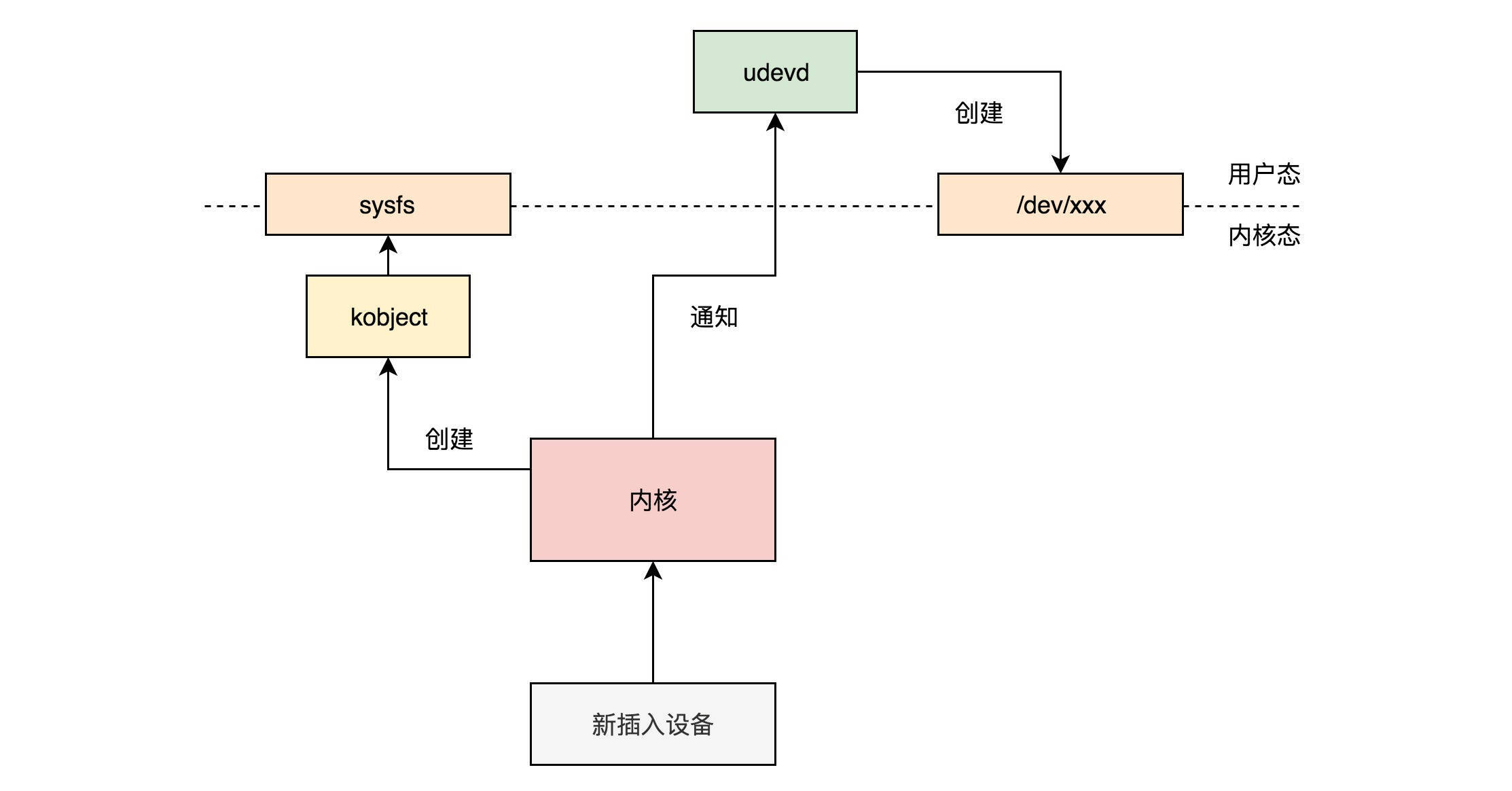 有了sysfs以后,我们还需要一个守护进程udev。当一个设备新插入系统的时候,内核会检测到这个设备,并会创建一个内核对象kobject 。 这个对象通过sysfs文件系统展现到用户层,同时内核还向用户空间发送一个热插拔消息。udevd会监听这些消息,在/dev中创建对应的文件。