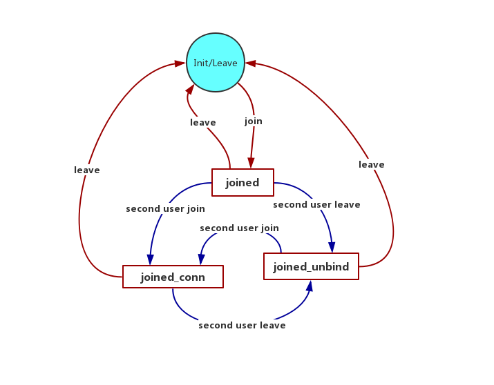 - 如果客户端收到 second user leave 消息,则切换到 joined_unbind 状态。其实 joined_unbind 状态与 joined 状态基本是一致的。
