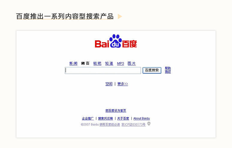 2002年,百度推出了一系列内容型搜索产品,比如百度MP3搜索,百度图片、新闻搜索;2003年又推出了当时最大的兴趣社区产品“百度贴吧”,这个产品后来一度占据了百度线上流量的11%;2005年,又上线了百度知道,将互动问答平台与搜索业务结合;2006年上线了百度百科,便于用户通过搜索引擎查询大量的基础词。