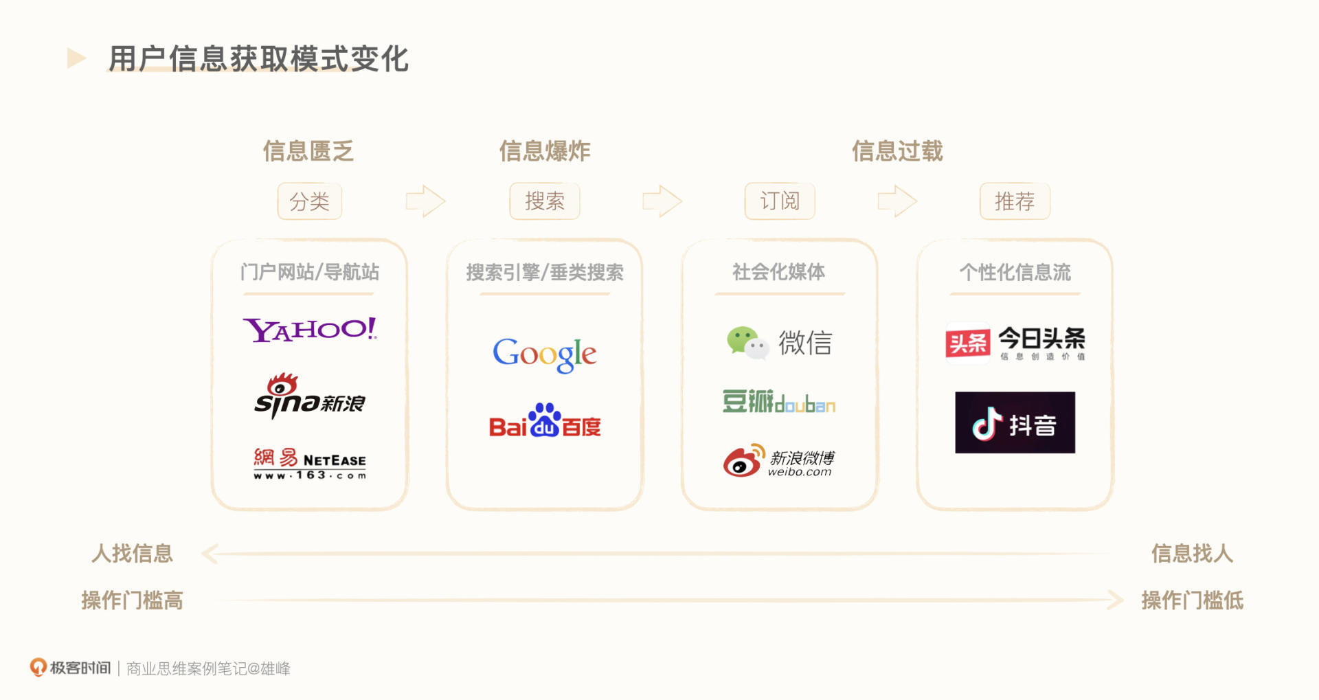 这就在搜索引擎以外,延展出了新的信息分发方式,一种是订阅关注(SNS时代),另一种是推荐算法(Feed时代),这两种方式都可以简化信息获取的方式,让用户获取信息变得更加容易,上手门槛更低。