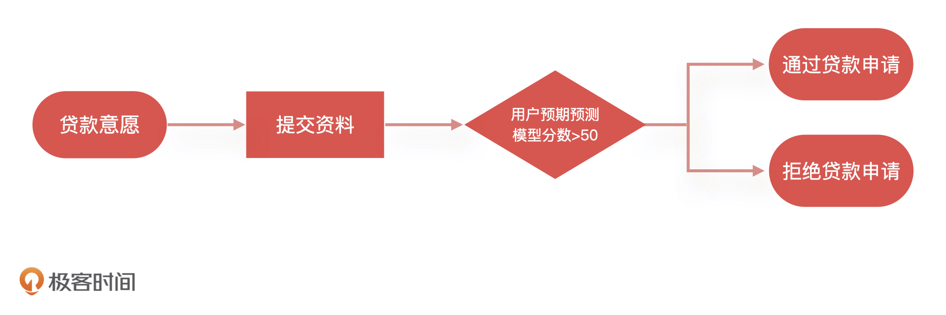 金融机构在给借款人放款之前会通过系统调用我们这个模型,如果模型返回“逾期”,金融机构就会拒绝借款人的贷款申请,反之就通过这个借款人的申请。下面是一个最为简单的信贷申请流程样例: