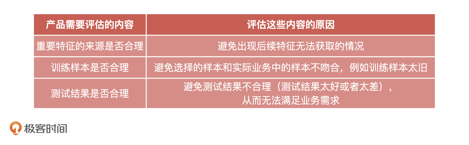 那为什么要对这三点进行评估呢?我在下面总结了一张表格,你可以先去看看。至于评估的具体方法我会在模型评估环节来讲。