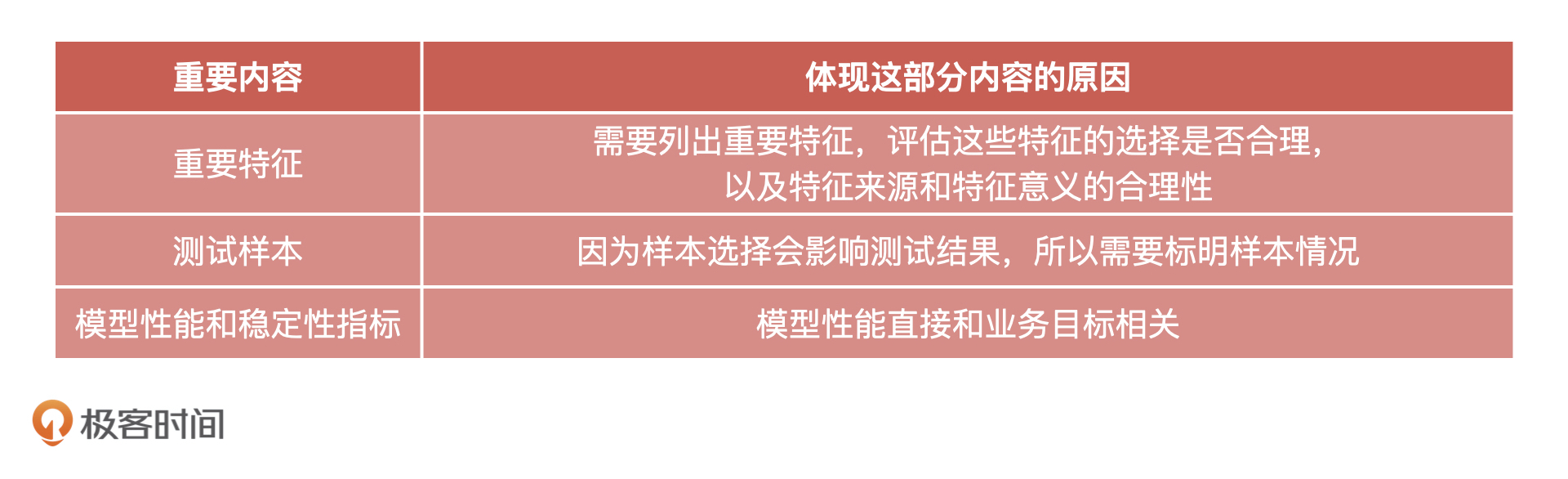 说了这么多,我再带你总结一下,模型评估环节的验收报告中必须要体现的内容,如下表所示: