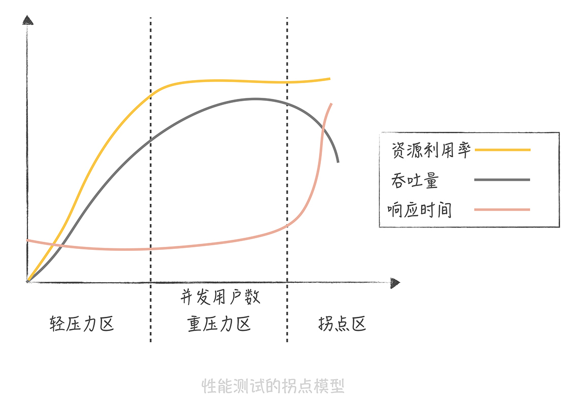 从图中你可以发现,并发用户数处于轻压力区时,响应时间平稳,吞吐量和并发用户数线性相关。而当并发用户数处于重压力区时,系统资源利用率到达极限,吞吐量开始有下降的趋势,响应时间也会略有上升。这个时候,再对系统增加压力,系统就进入拐点区,处于超负荷状态,吞吐量下降,响应时间大幅度上升。