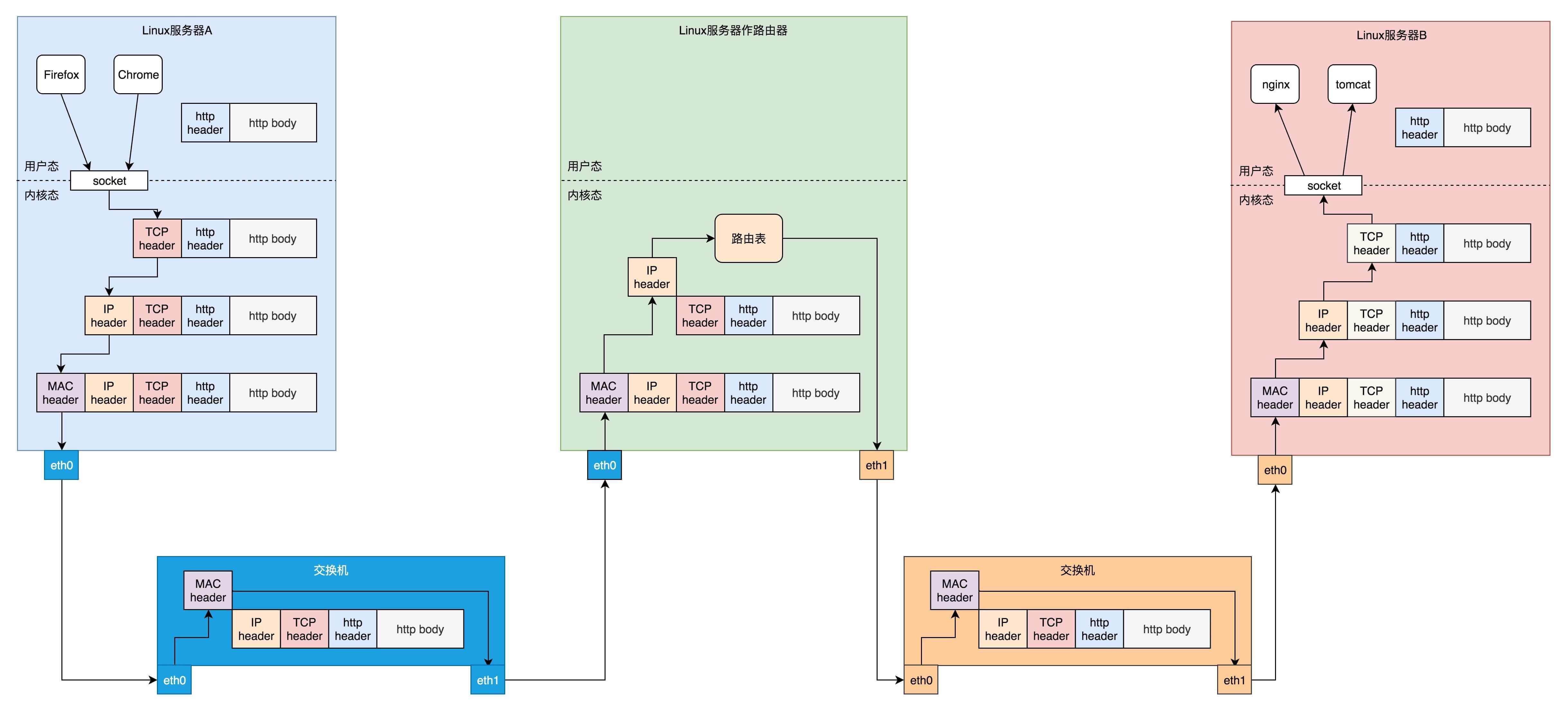 二层到四层都是在Linux内核里面处理的,应用层例如浏览器、Nginx、Tomcat都是用户态的。内核里面对于网络包的处理是不区分应用的。