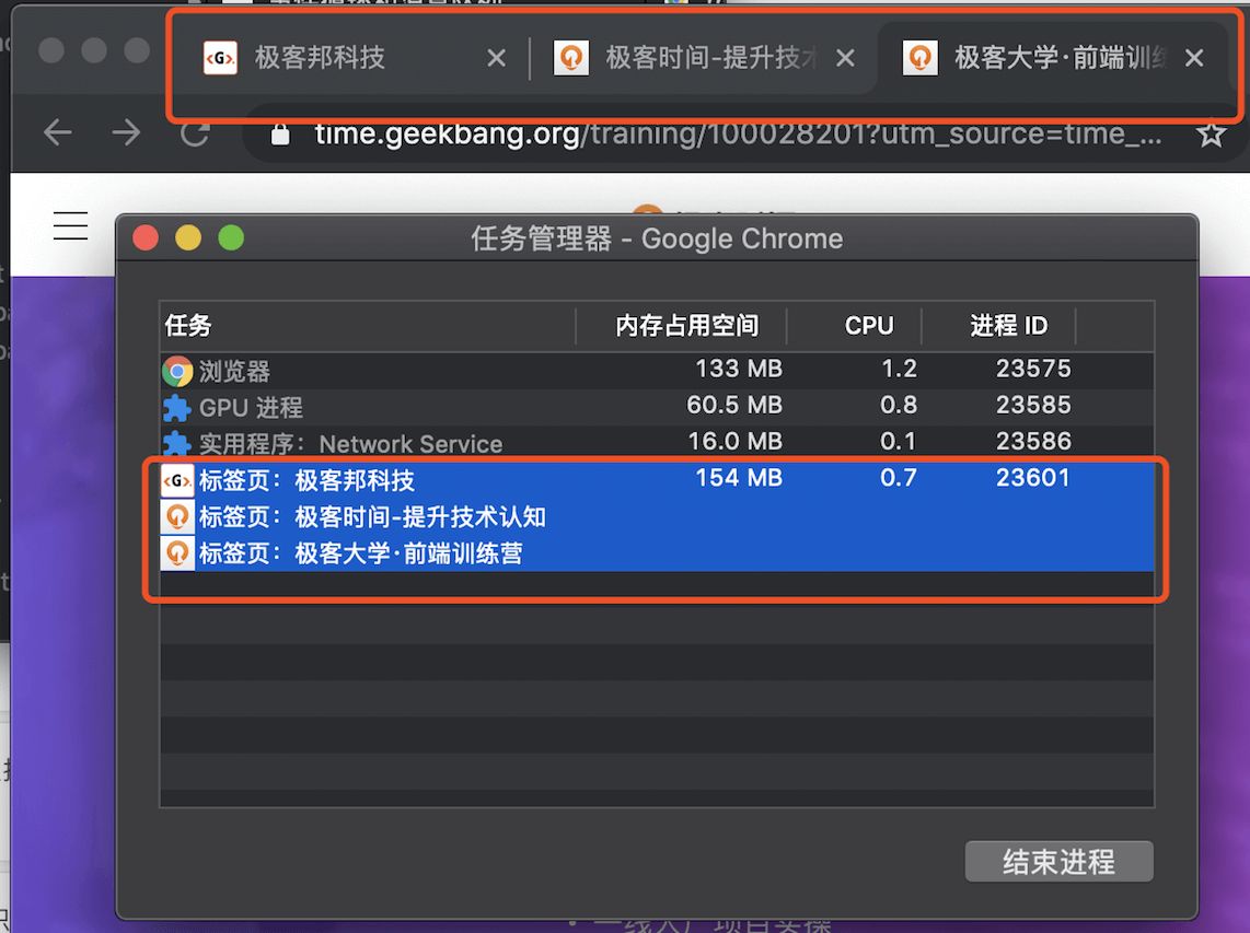 比如我从极客时间的首页里面打开了另外一个页面——算法训练营,我们看下图的Chrome的任务管理器截图: