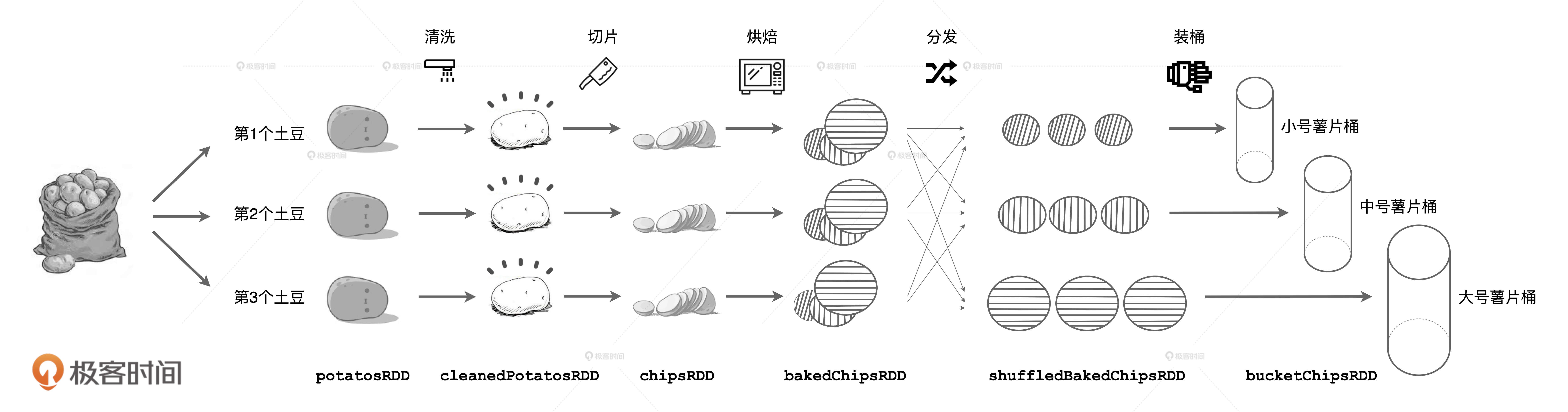 - 不同的食材形态,如带泥的土豆、土豆切片、烘烤的土豆片等等,对应的就是RDD;