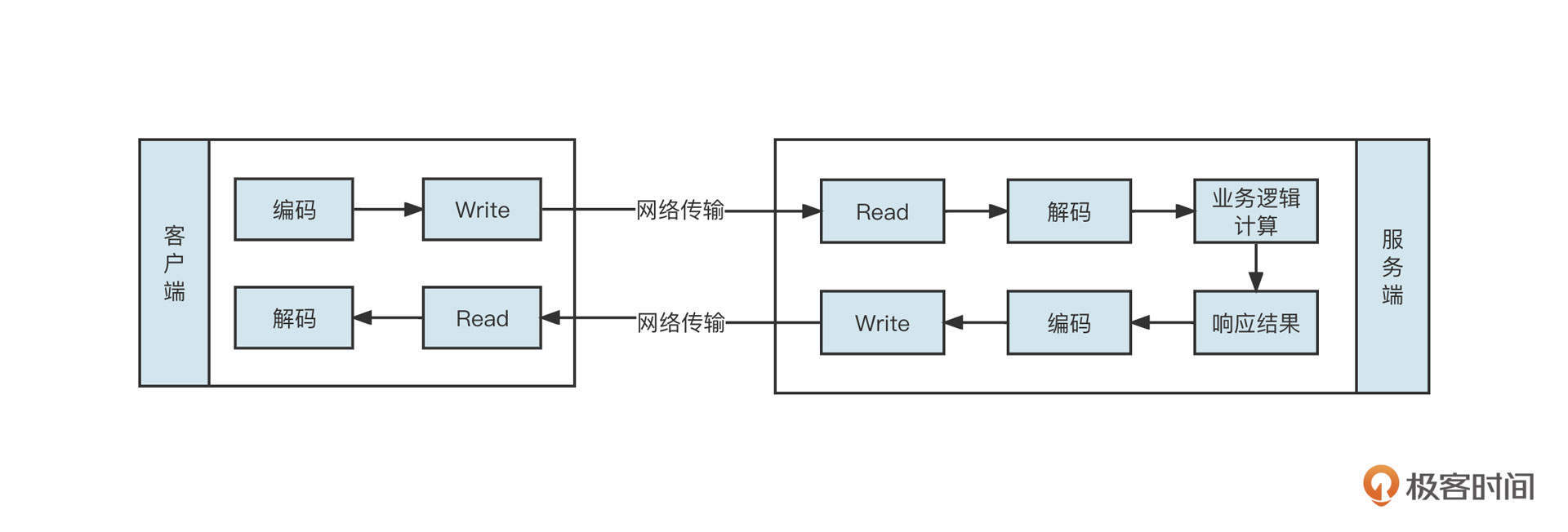 从这里你也可以看出,网络编程中通常涉及编码、往网络中写数据(Write)、从网络中读取数据(Read)、解码、业务逻辑处理、发送响应结果和接受响应结果等步骤,你可以看下下面这张图,加深理解: