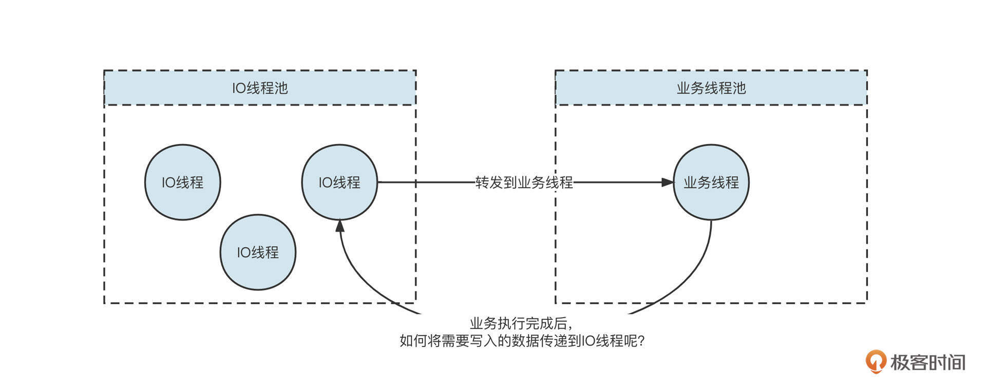基于Netty网络模型,通常会使用一个业务线程池来执行业务操作,业务执行完成后,需要通过网络将响应结果提交给对应的IO线程,再通过IO线程将数据返回给客户端,其过程大致如下:
