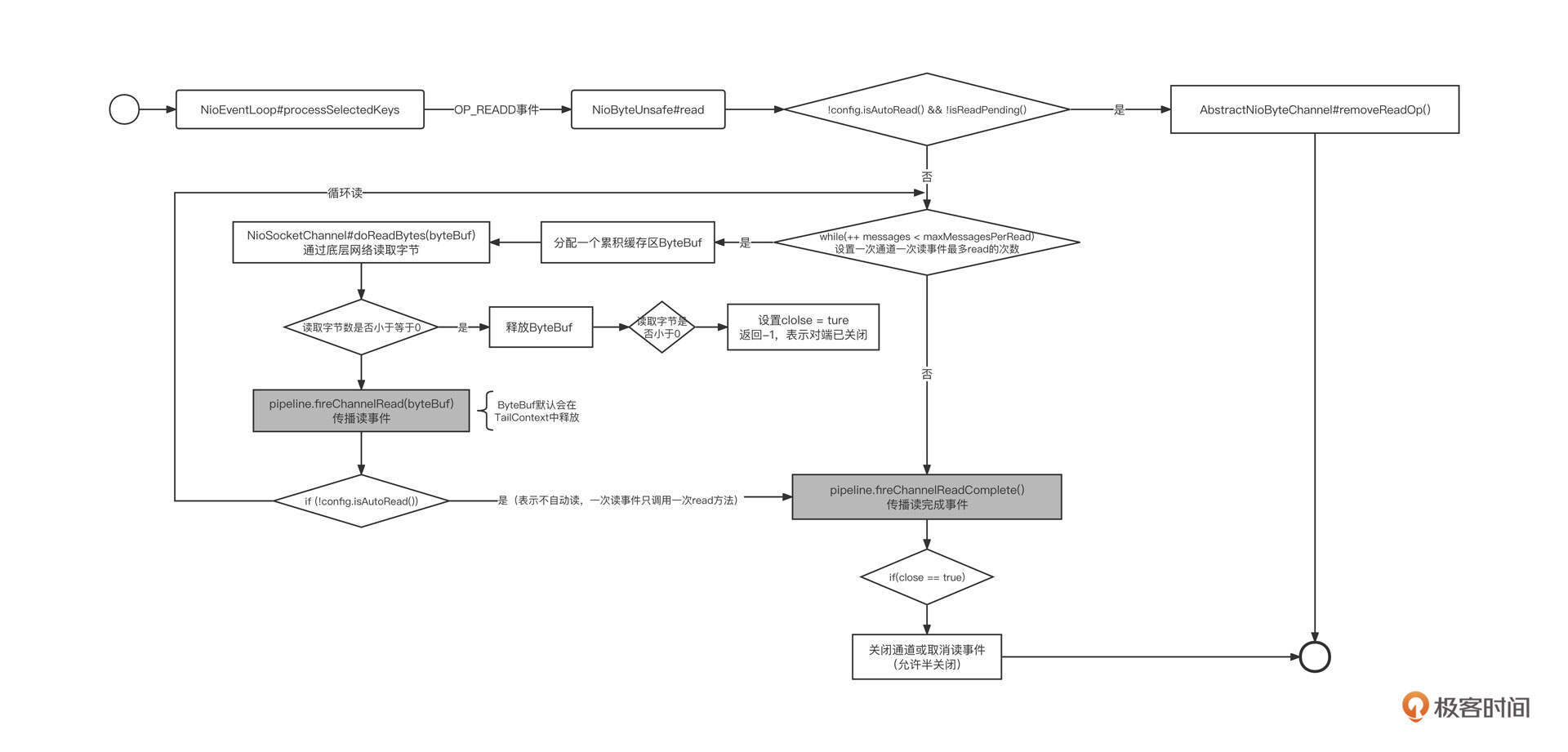 Netty网络读流程就讲到这里了,我们用一张流程图结束网络读取部分的讲解: