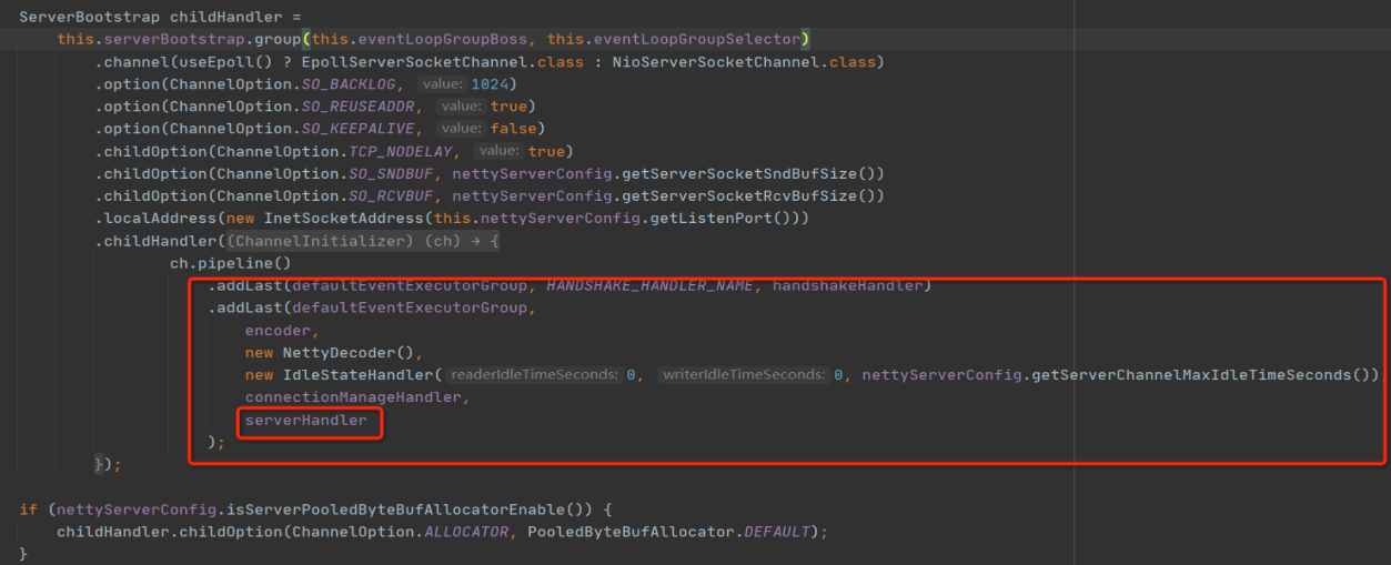 - 将编码、解码、业务逻辑处理相关的事件处理器加入到事件执行链条。