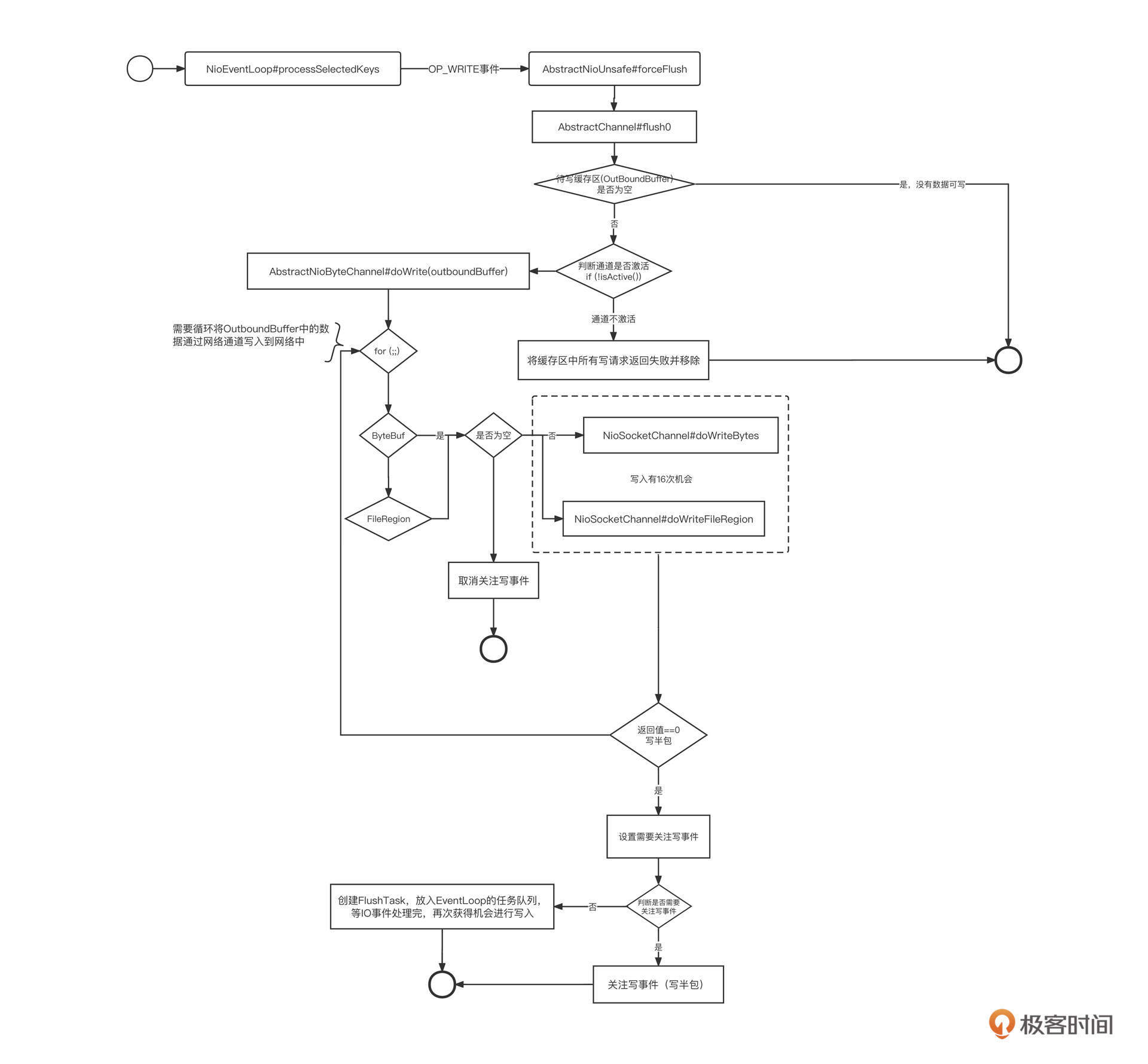 - 如果写缓存区中的数据很大,为了避免单个通道对其他通道的影响,默认设置单次写事件最多调用底层 NIO SocketChannel的write方法的次数为16。