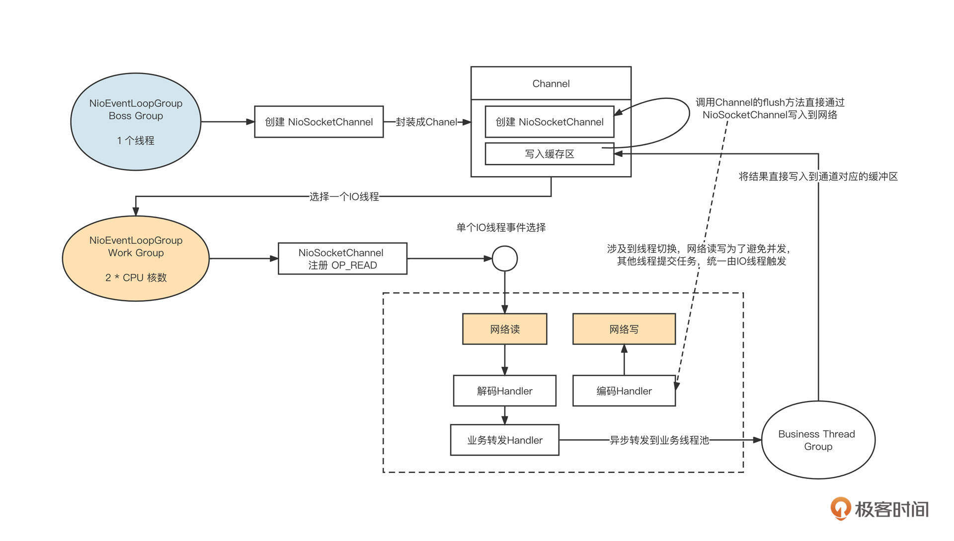 业务线程在处理完业务逻辑后,通过调用通道将数据发送到目标端。但它并不能当下直接发送,而是要将数据放入到Channel中的写缓存区,并向IO线程提交一个写入任务。这里涉及到线程切换,因为所有的读写操作都需要在IO线程中执行(即一个通道的IO操作都是同一个线程触发的),避免了多线程编程的复杂性。