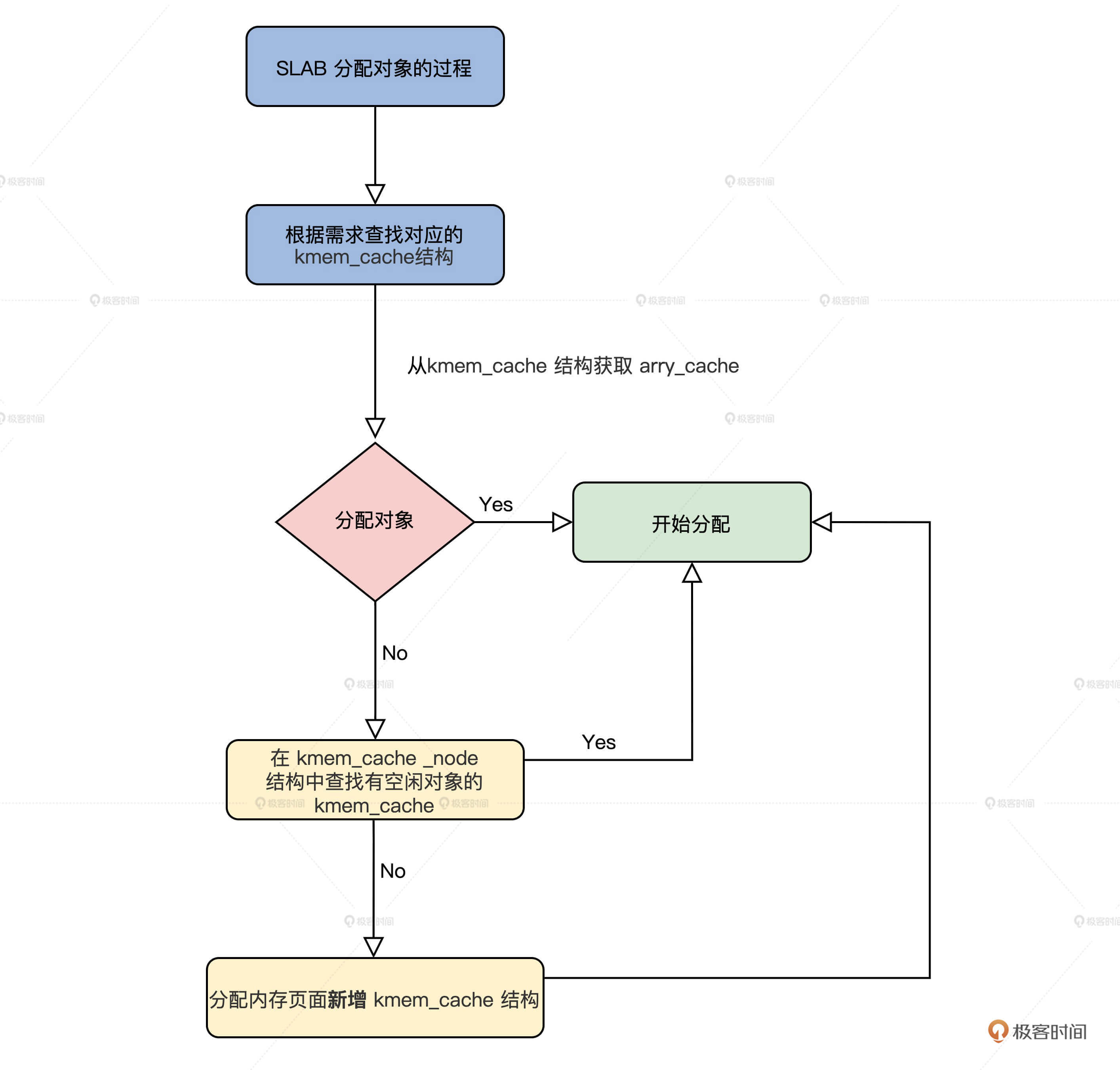 有了前面对SLAB数据结构的了解,SLAB分配对象的过程你自己也能推导出来,无非是根据请求分配对象的大小,查找对应的kmem_cache结构,接着从这个结构中获取arry_cache结构,然后分配对象。