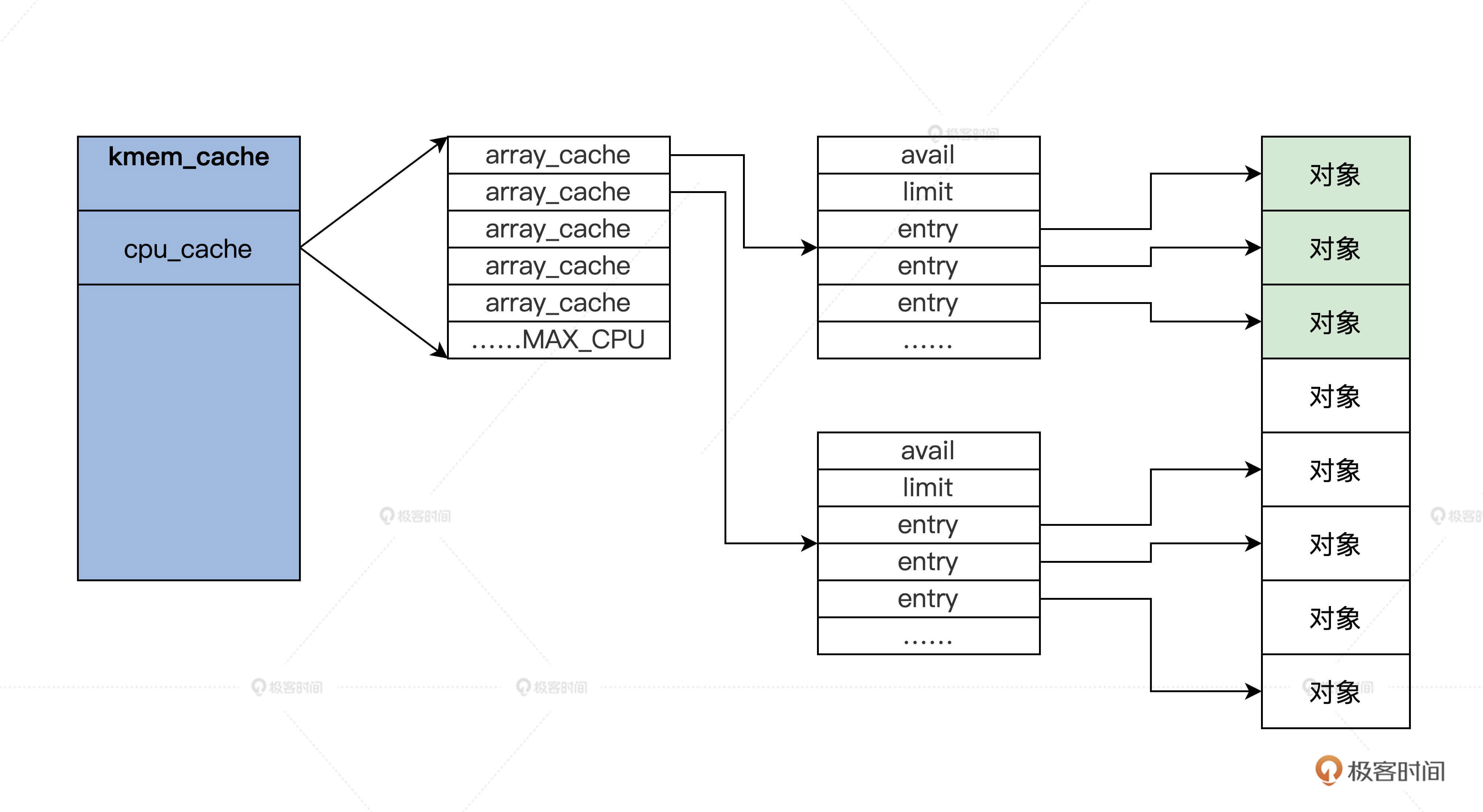array_cache,每个CPU一个,用于管理空闲对象。 array_cache的entry数组,用于管理这些空闲对象,出入遵循LIFO原则;