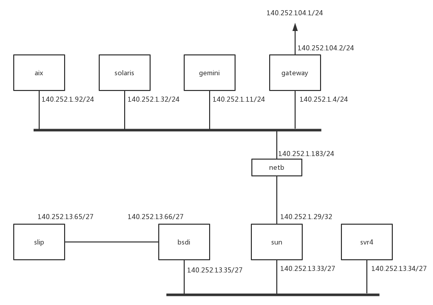 - 对于bsdi和svr4来讲,如果去外网,sun下面的网口13.33是网关。