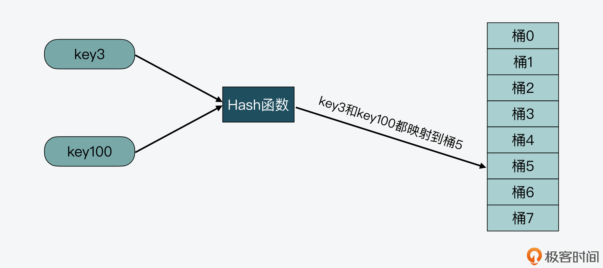比如下图中,key3和key100都被映射到了Hash表的桶5中,这样,当桶5只能保存一个key时,key3和key100就会有一个key无法保存到哈希表中了。