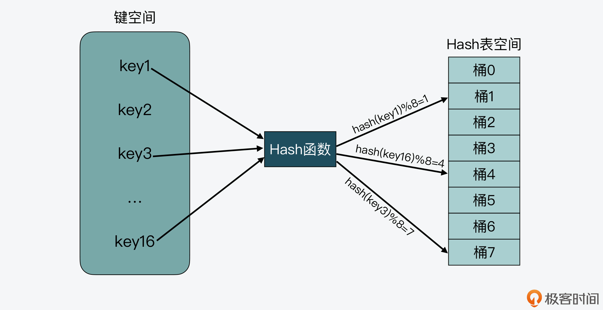 如下图所示,key1经过哈希计算和哈希值取模后,就对应哈希桶1,类似的,key3和key16分别对应哈希桶7和桶4。