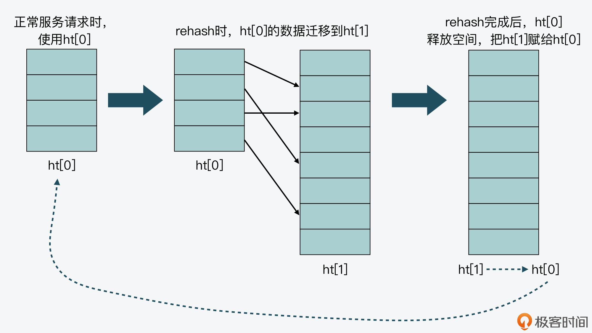 - 而在ht[1]赋值给ht[0]后,它的大小就会被重置为0,等待下一次rehash。与此同时,全局哈希表中的rehashidx变量会被标为-1,表示rehash结束了(这里的rehashidx变量用来表示rehash的进度,稍后我会给你具体解释)。