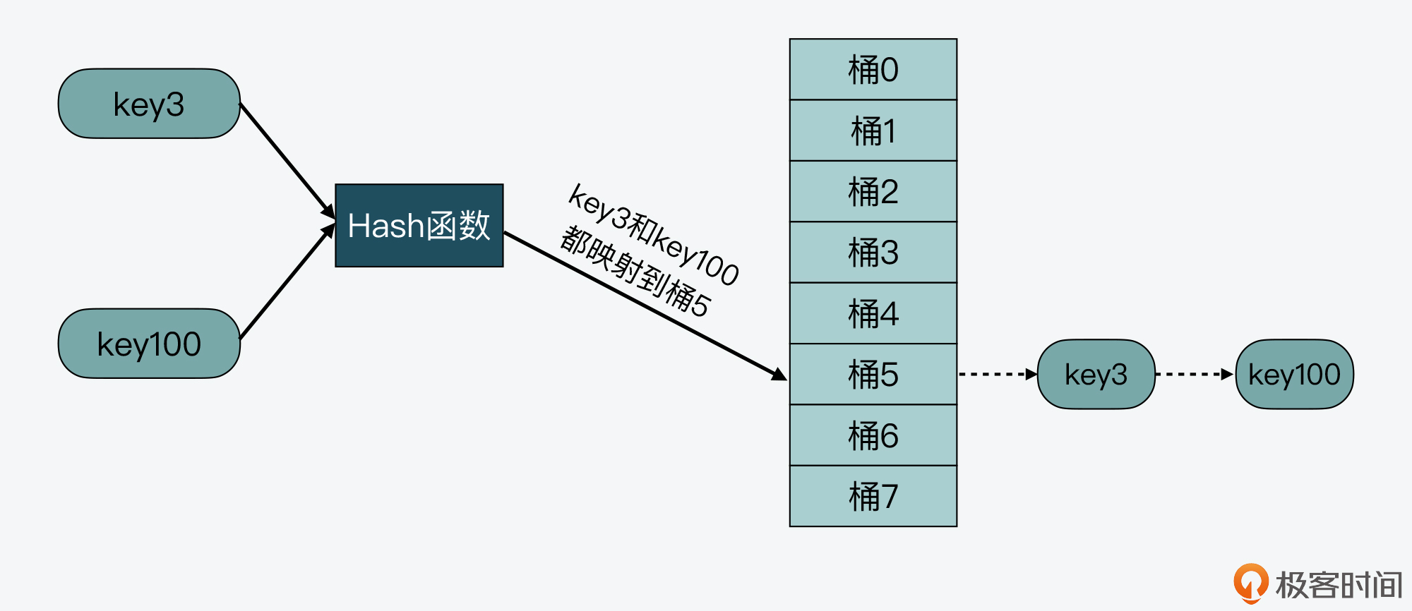 别着急,我就拿刚才的例子来说明一下,key3和key100都被映射到了Hash表的桶5中。而当使用了链式哈希,桶5就不会只保存key3或key100,而是会用一个链表把key3和key100连接起来,如下图所示。当有更多的key被映射到桶5时,这些key都可以用链表串接起来,以应对哈希冲突。