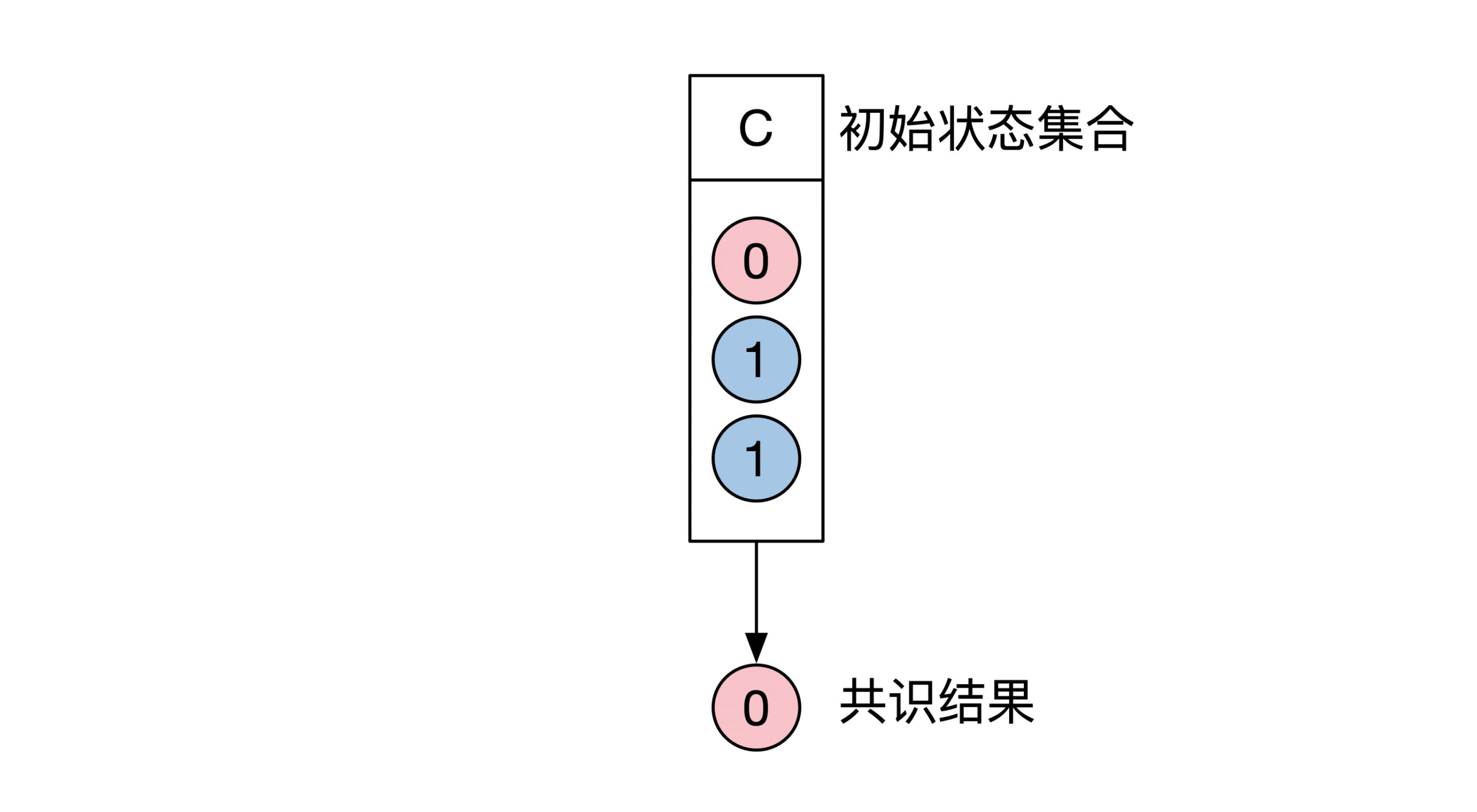 我们假设C2和C3对应的共识结果都为0,这样C3和C1这两个相邻的初始状态集合,就会有不同的共识结果: