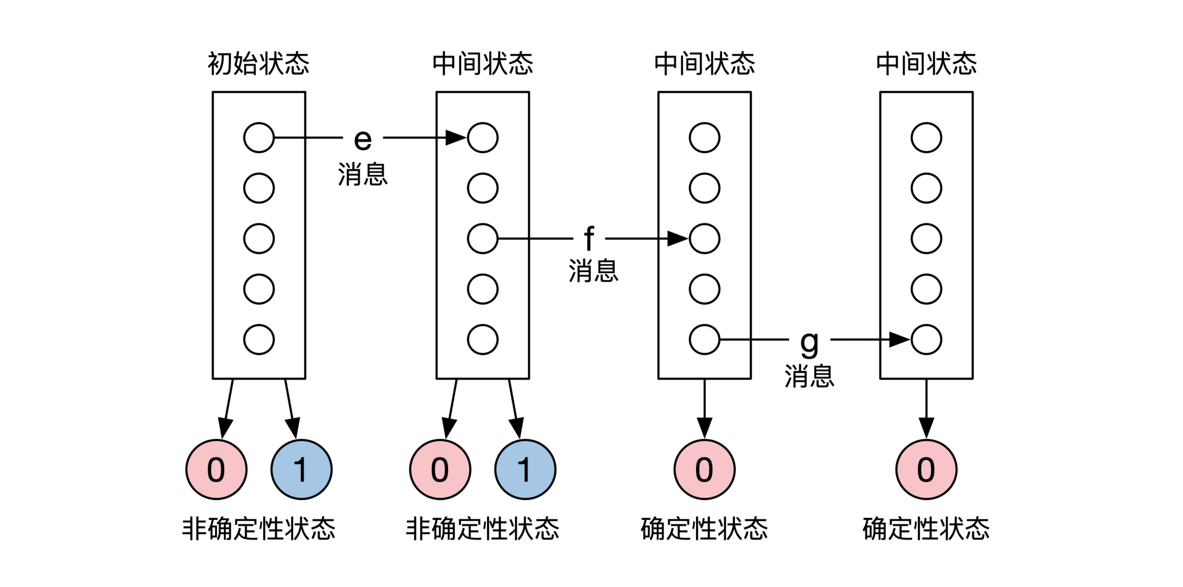 和第一步证明一样,分布式系统的状态也分为非确定性状态和确定性状态两种。系统可能从非确定性状态运行至确定性状态,但是反过来不行。路径和两种状态的示意图如下: