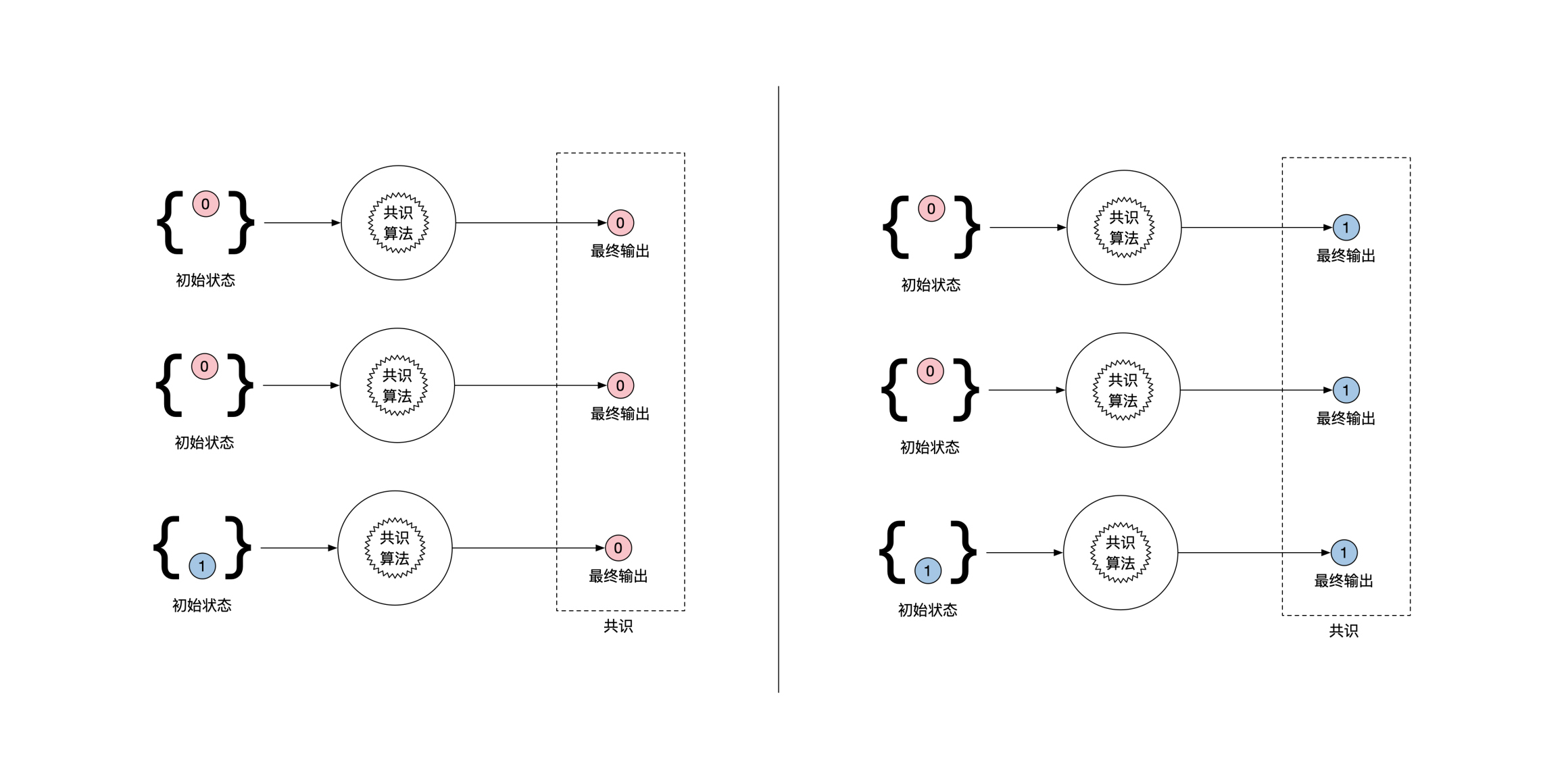 一致性相对好理解一点。一致指所有结果都需要完全相同。终止性和一致性有一个更通俗的解释:所有机器的状态初始可以在0和1中任意选择,最后当共识算法结束的时候,所有还活着的机器需要输出一样的结果,要么都是0,要么都是1。示意图如下: