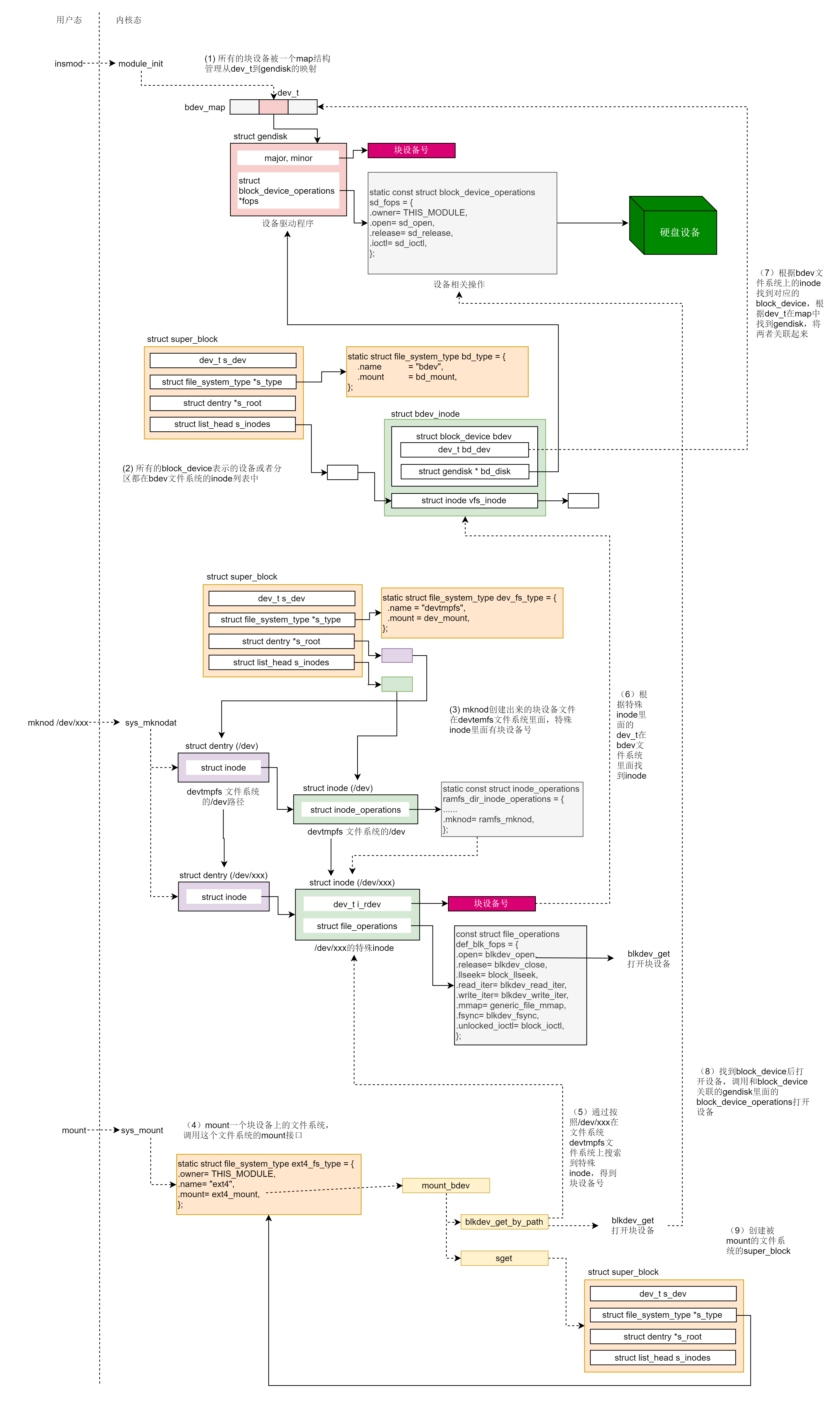 总结时刻 从这一节我们可以看出,块设备比字符设备复杂多了,涉及三个文件系统,工作过程我用一张图总结了一下,下面带你总结一下。