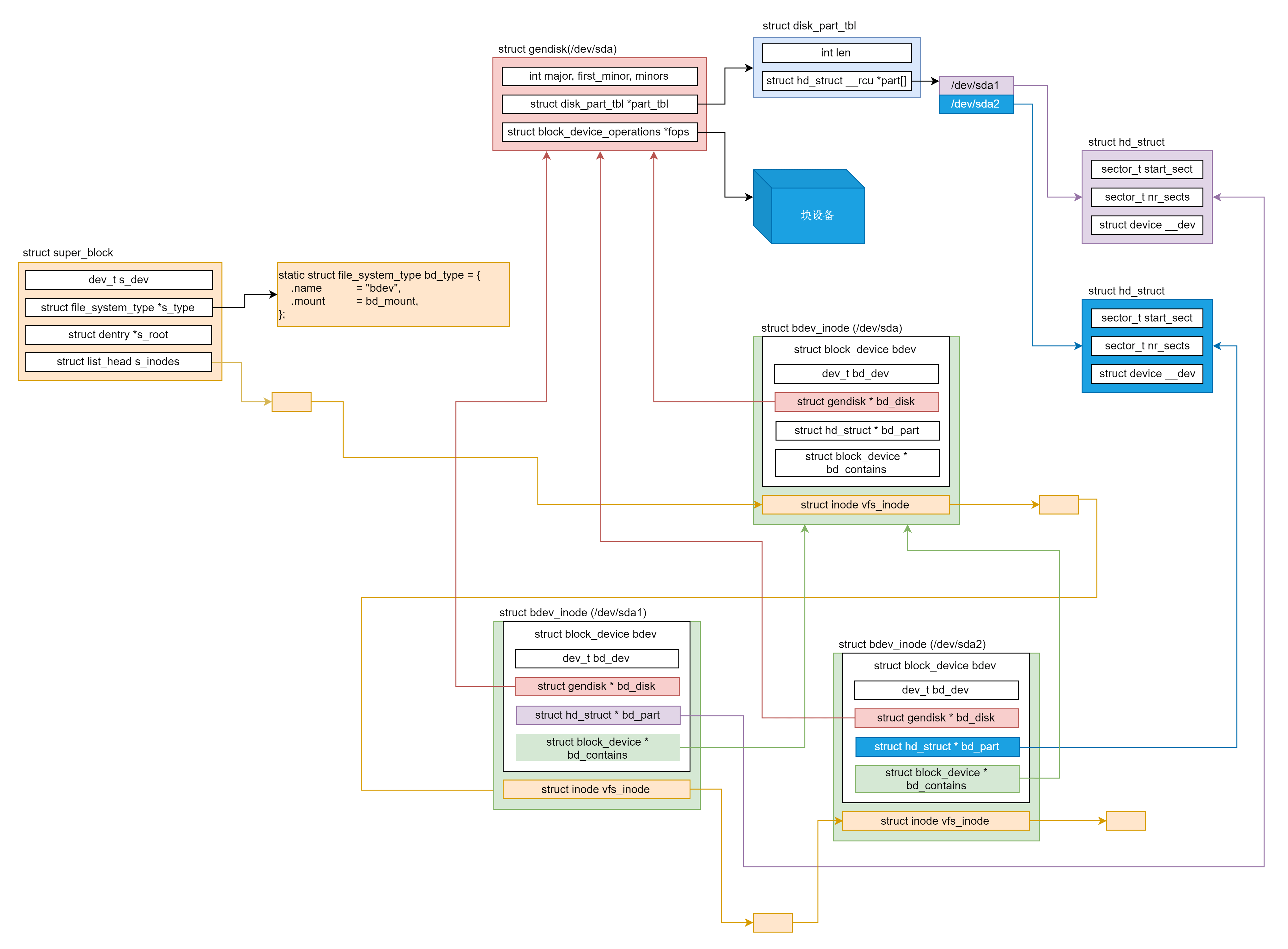 而block_device既可以表示整个块设备,也可以表示某个分区,所以对于上面的例子,block_device有三个实例,分别指向/dev/sda1、/dev/sda2、/dev/sda。
