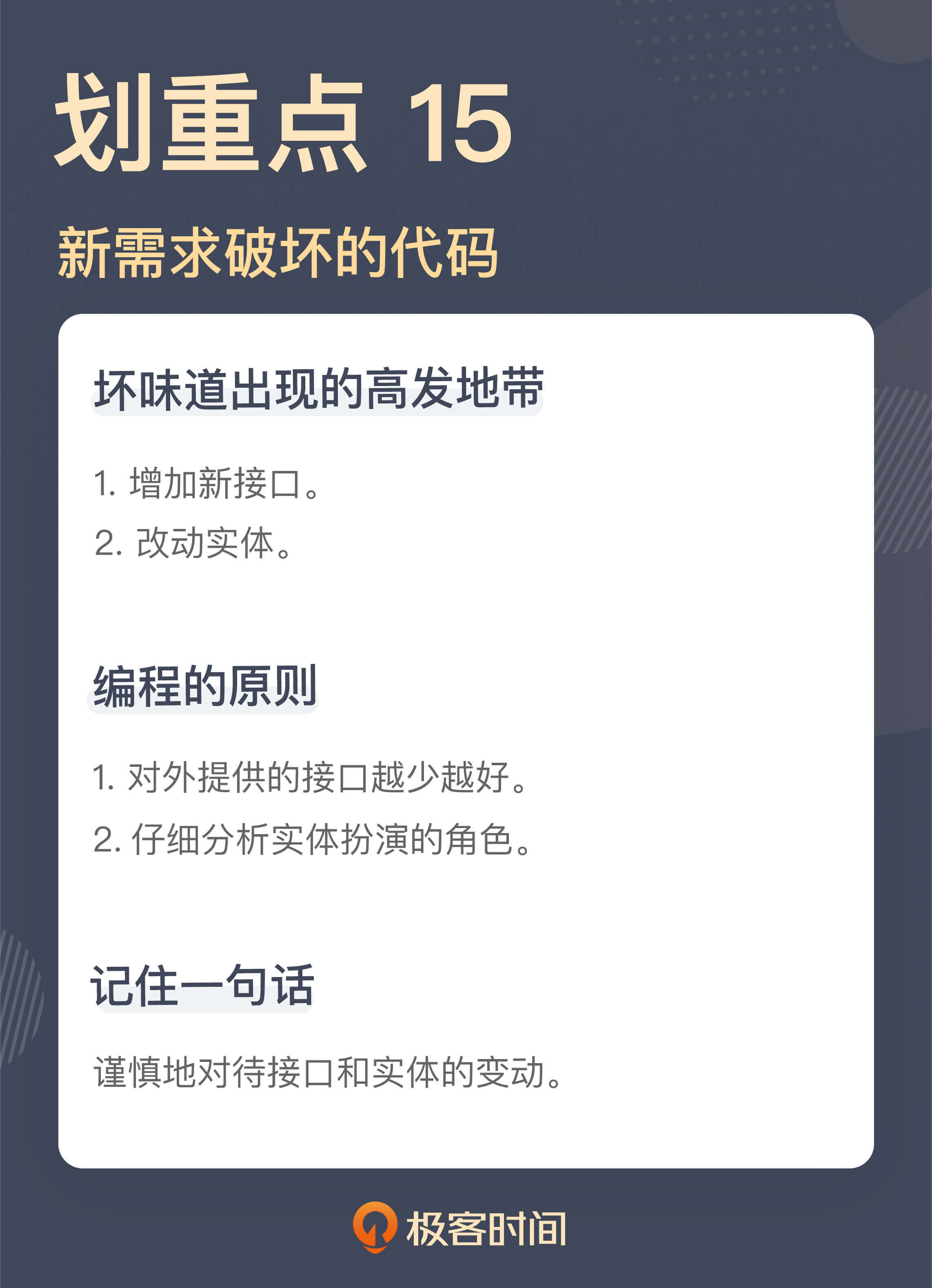 我前面课程讲的所有坏味道都是告诉你如何在已有的代码中发现问题。不过你要明白,即便我们能够极尽所能把代码写整洁,规避各种坏味道,但我们小心翼翼维护的代码,还是可能因为新的需求到来,不经意间就会破坏。