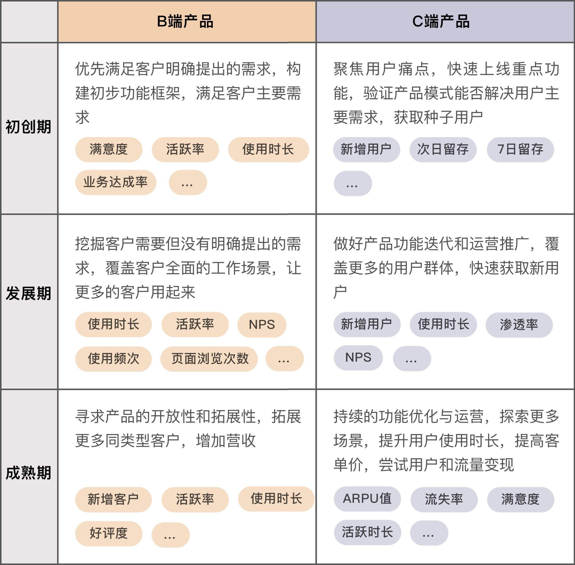 那么,产品在不同阶段会有怎样的特点?面对不同特点,我们如何调整量化手段来应对呢?以及B端和C端的产品在不同的生命周期,有哪些区别呢?