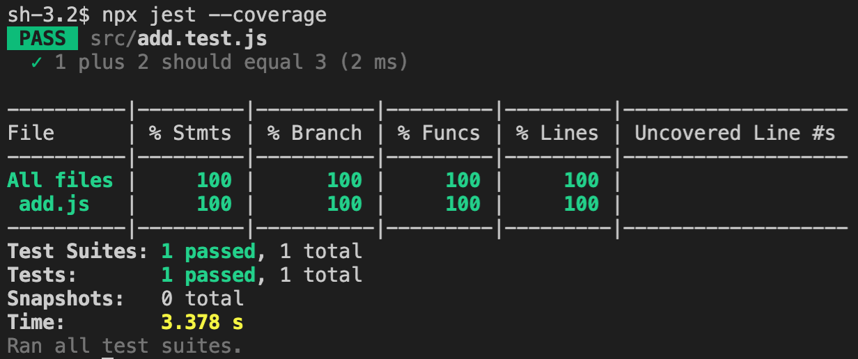 可以看到,我们的测试用例运行成功。而且,我们通过给 jest 命令加上 –coverage 参数,还得到了自动生成的覆盖率报告。